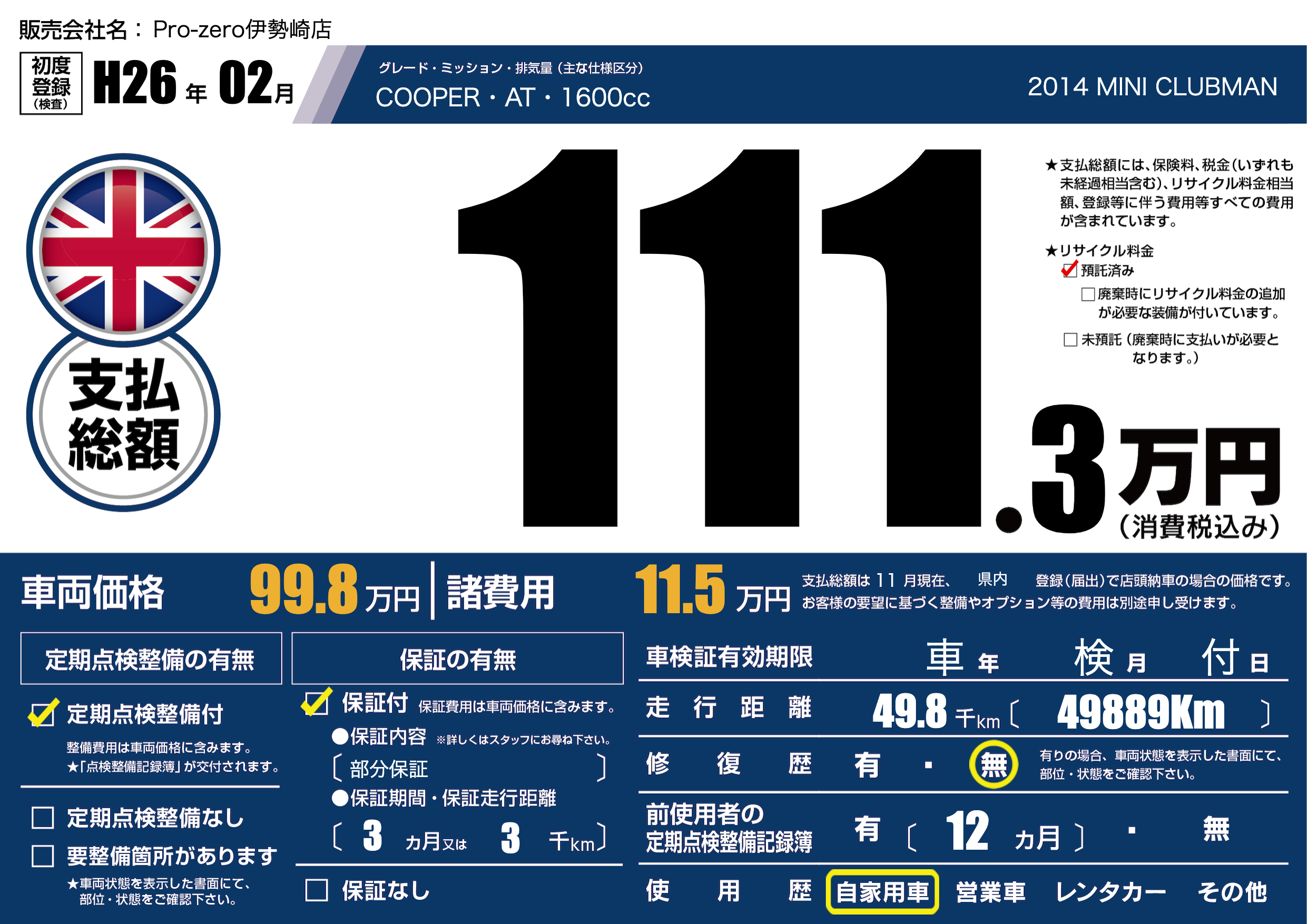 | 車名 | 2014 MINI CLUBMAN | グレード ミッション 排気量 |