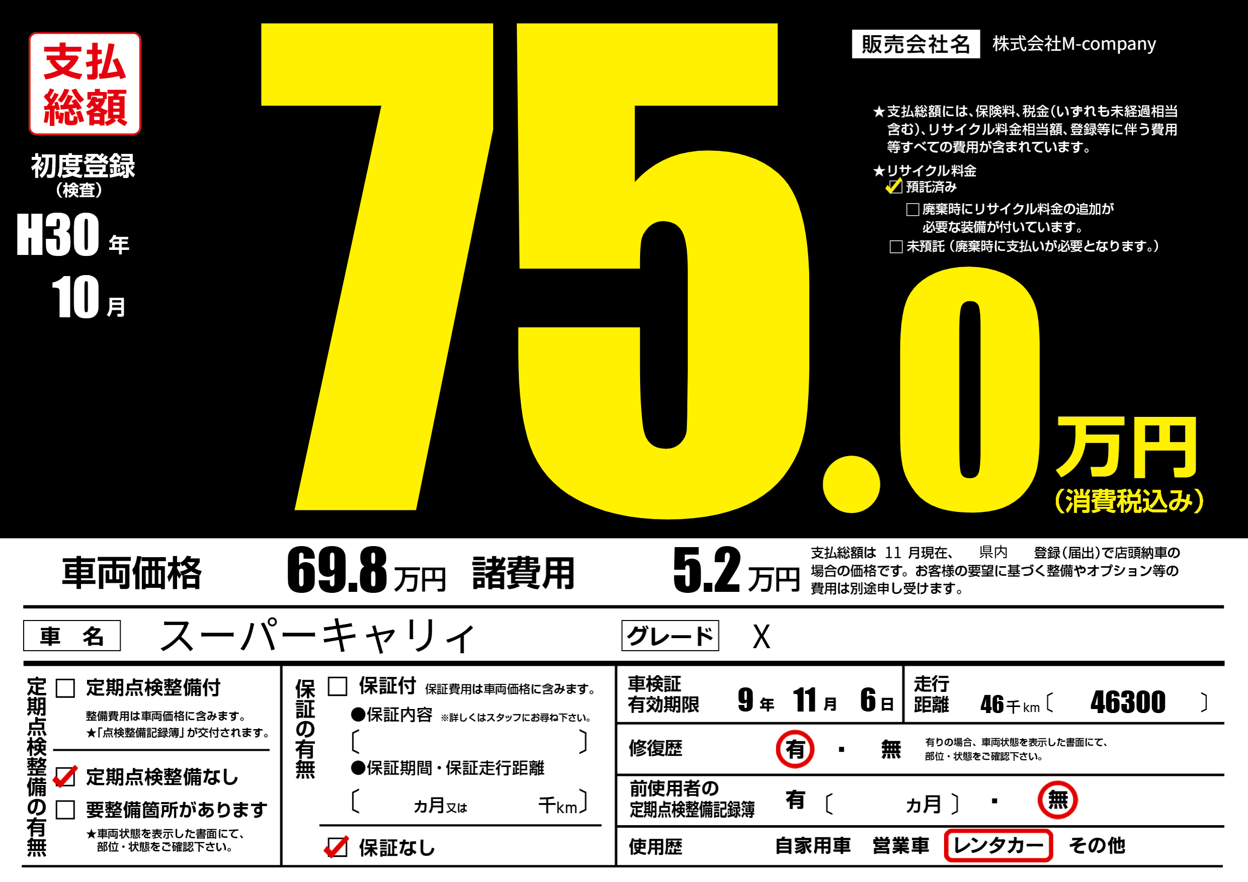 | 車名 | スーパーキャリィ | グレード ミッション 排気量 |