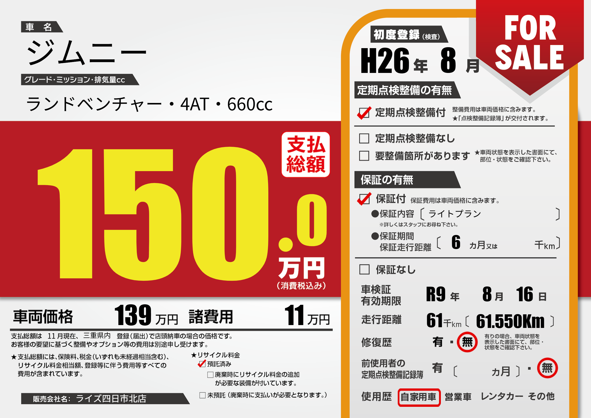 なし | 車検制限 | R9年8月16月 |