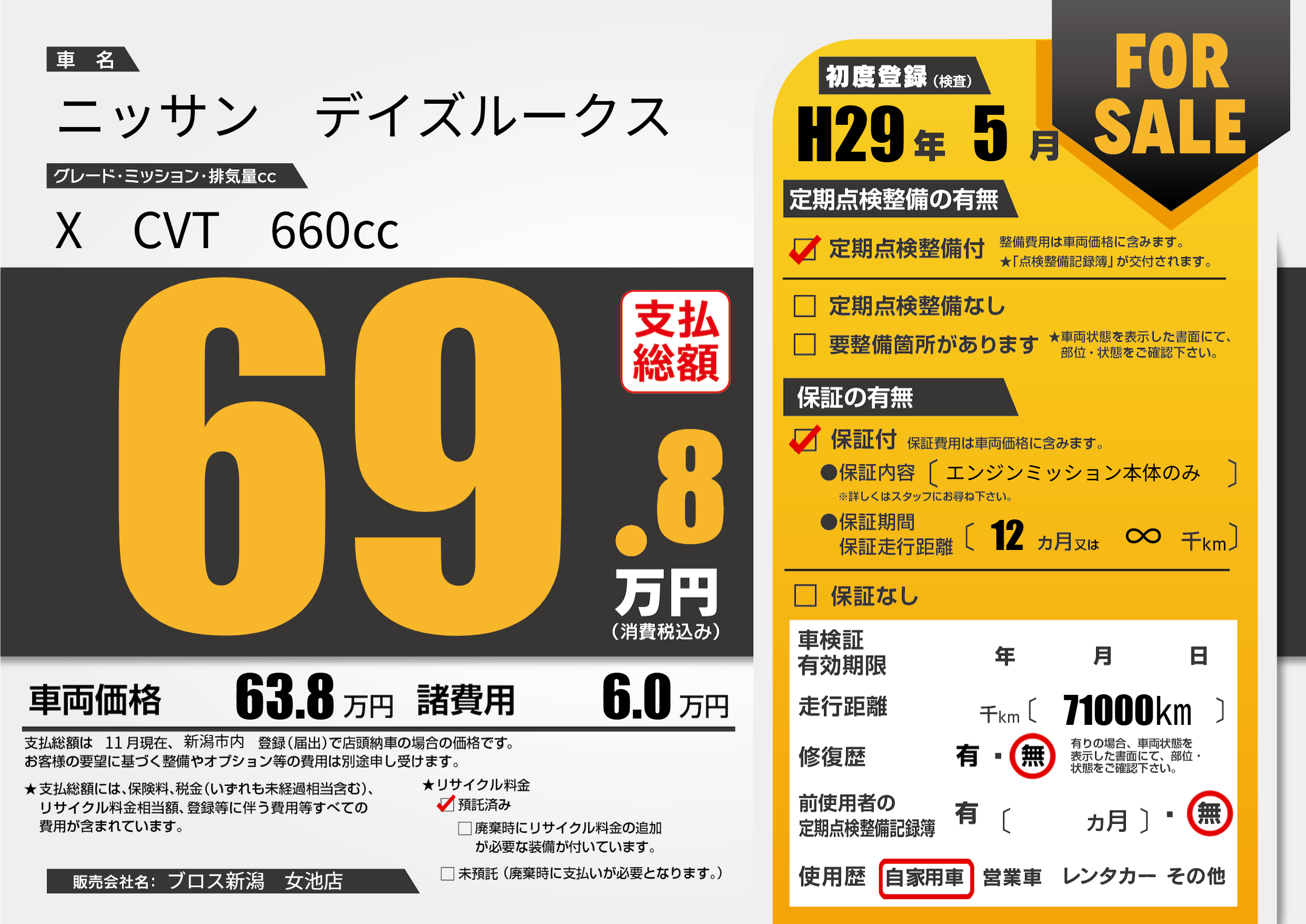 | 車名 | ニッサン デイズルークス | グレード ミッション 排気量 |