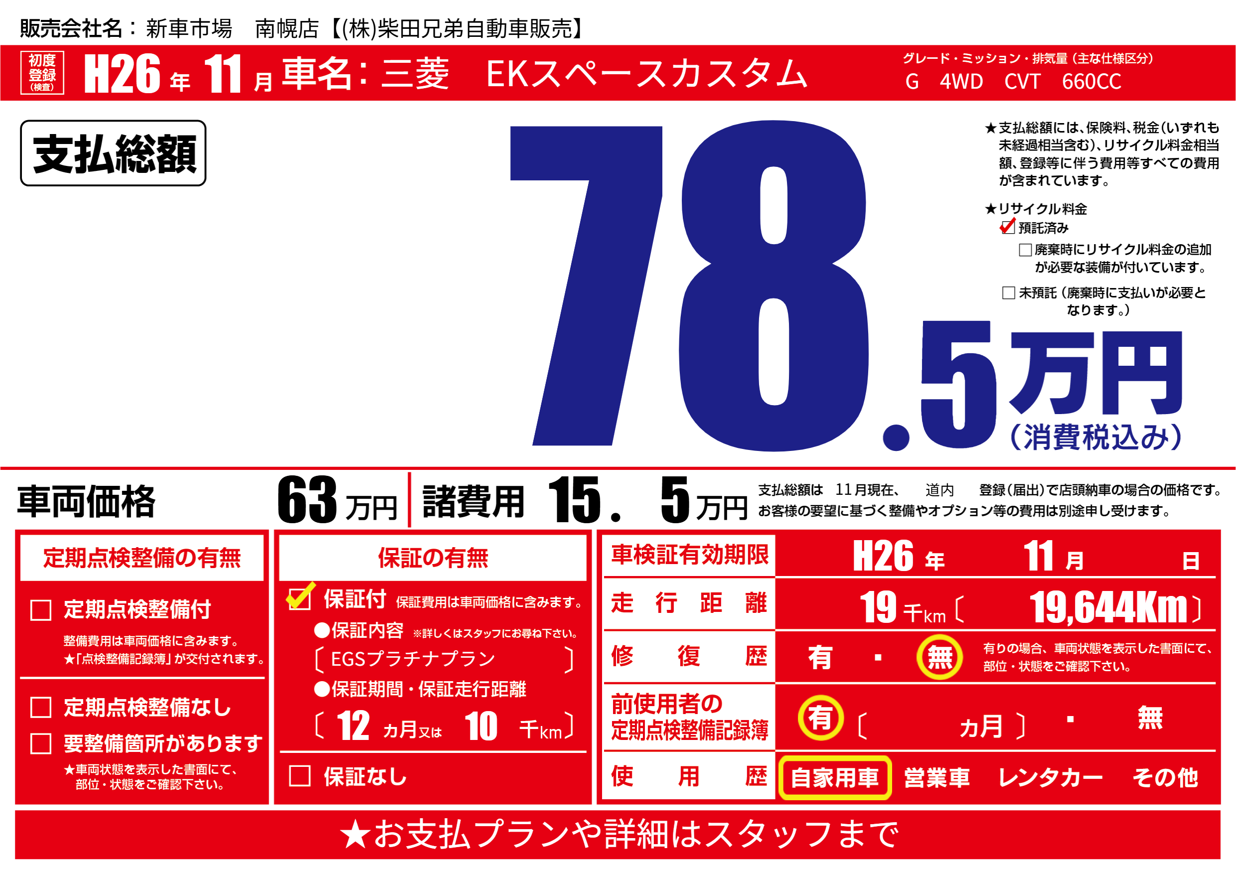 | 走行キロ | 1.9万km | 初年度登録 | H26年11月 |