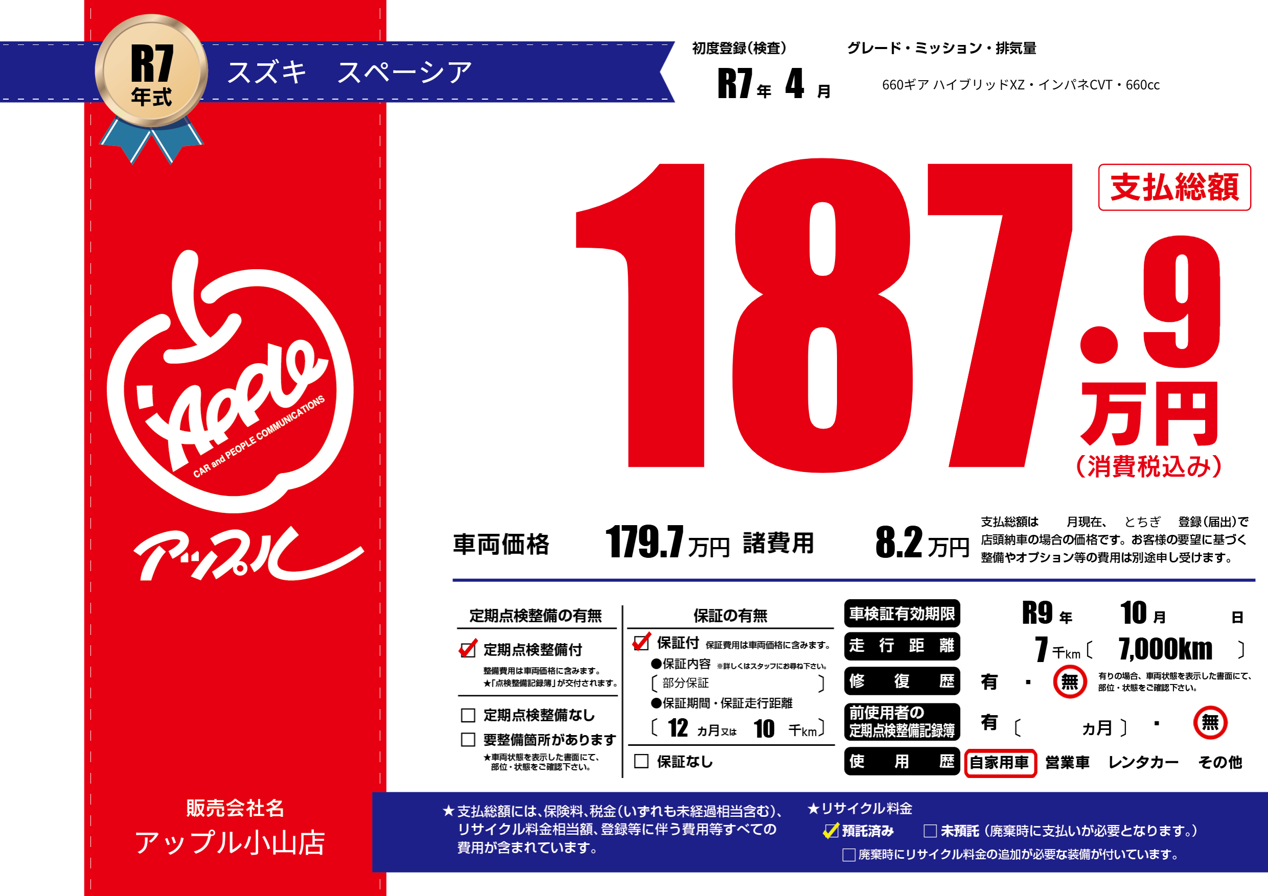 | 走行キロ | 0.7万km | 初年度登録 | R7年4月 |