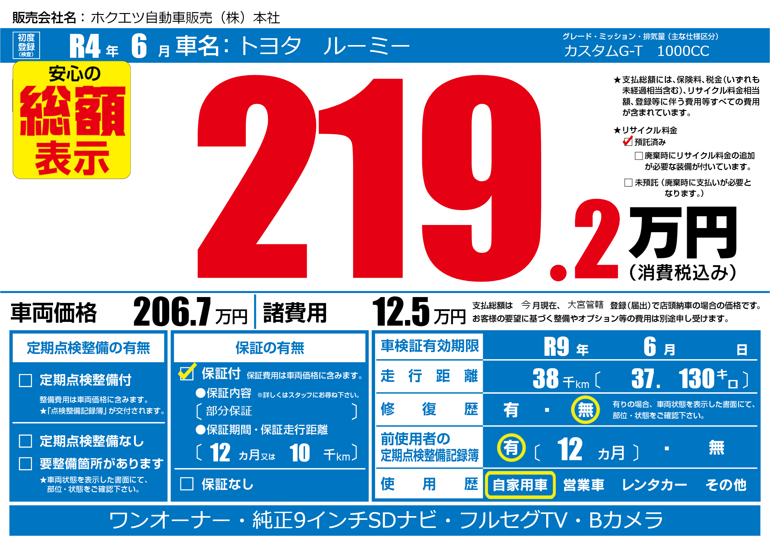 | 車検制限 | R9年 6月 - 日 | ||