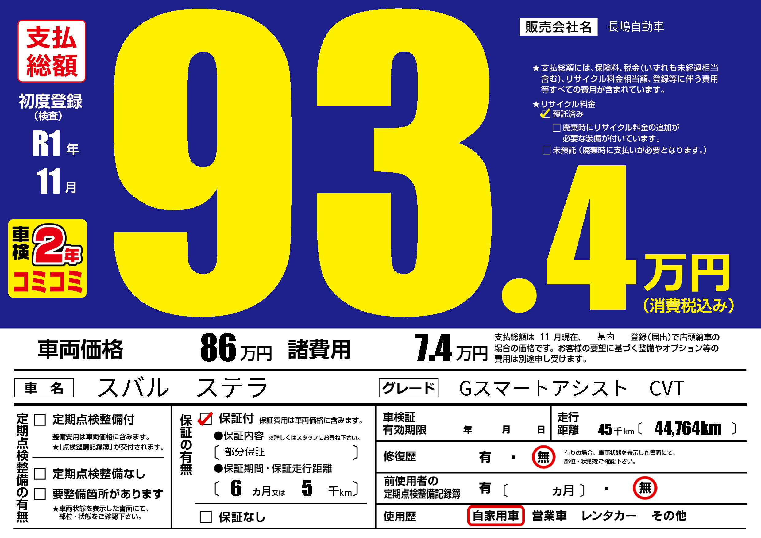 保証付き 保証内容(部分保証) 6ヶ月または(5)千kmまで |