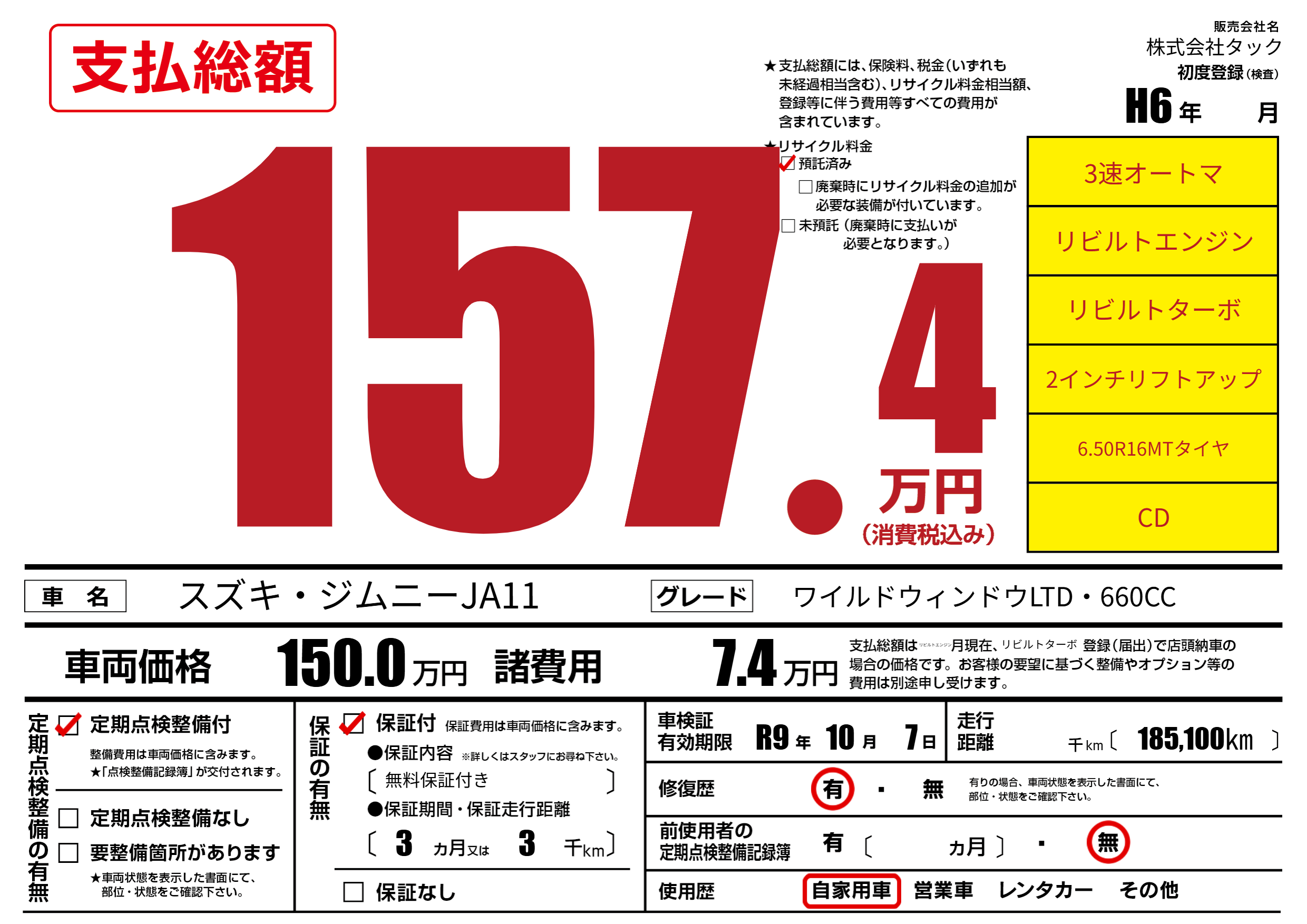| 車名 | スズキ・ジムニーJA11 | グレード ミッション 排気量 |