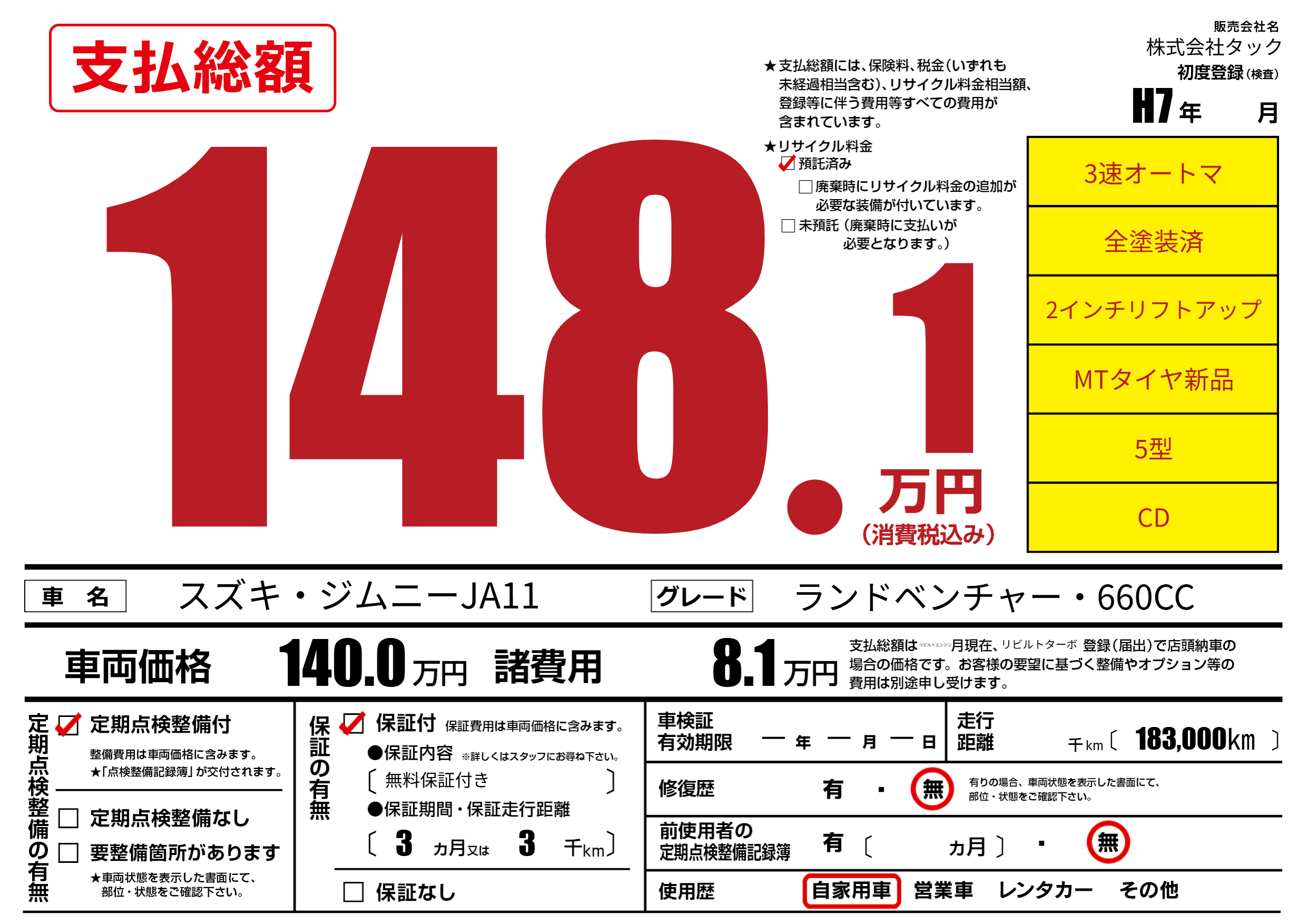 | 車名 | スズキ・ジムニーJA11 | グレード ミッション 排気量 |