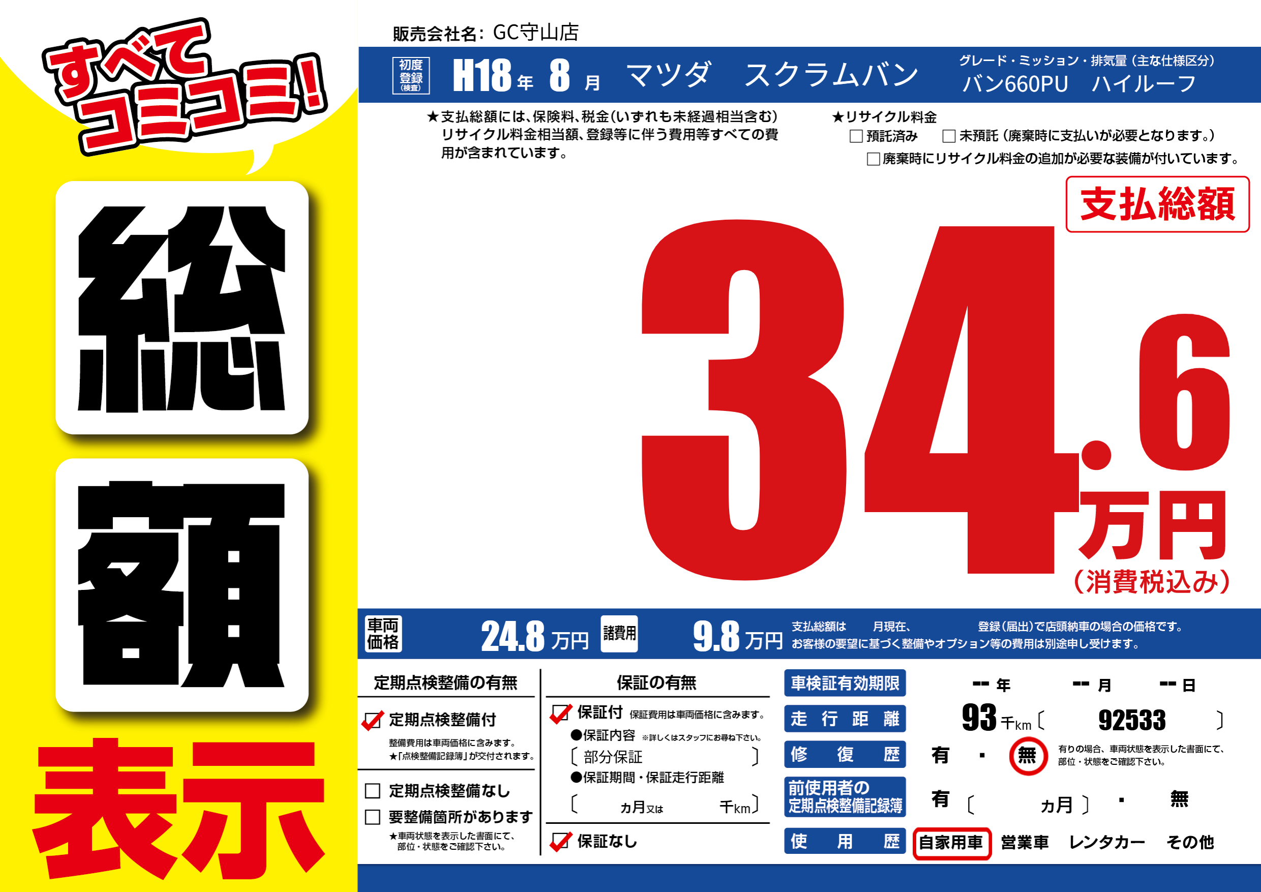 | 走行キロ | 9.3万km | 初年度登録 | H18年8月 |