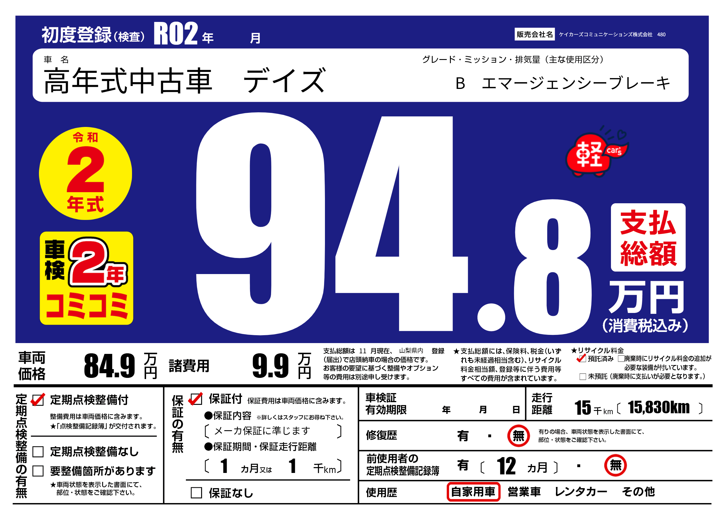 | 車名 | 高年式中古車 デイズ | グレード ミッション 排気量 |