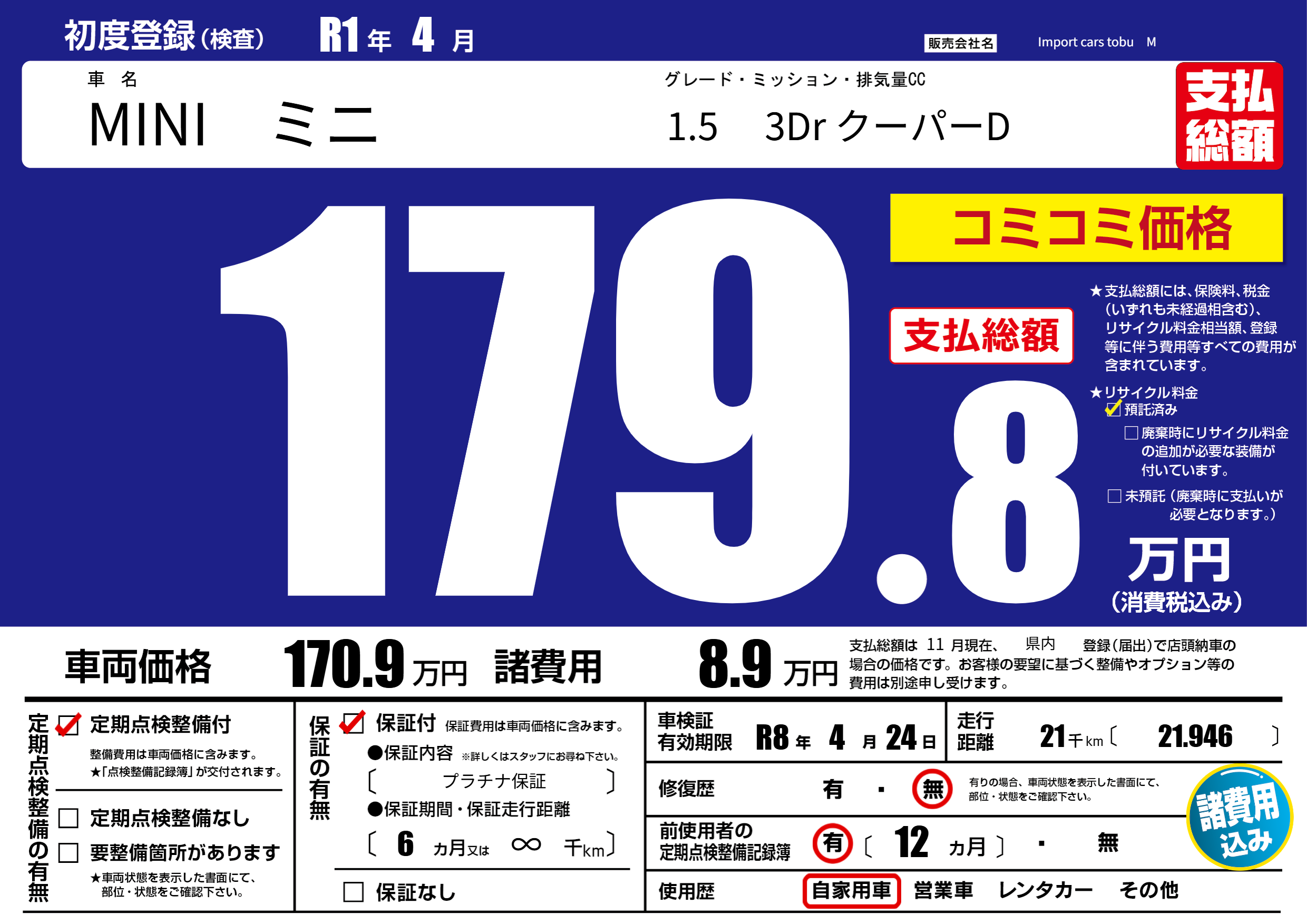 保証付き 保証内容( プラチナ保証) 6ヶ月または(∞)千kmまで |