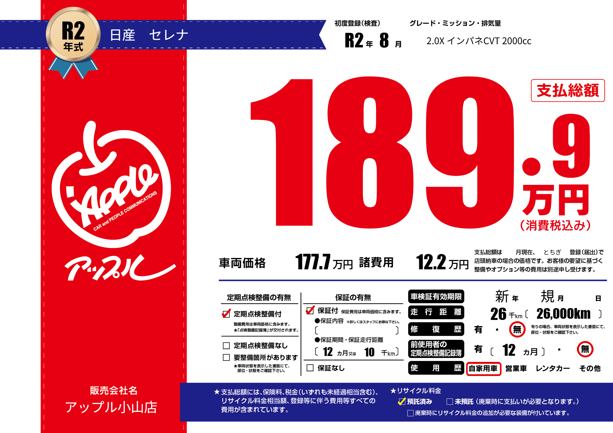 | 車名 | 日産 セレナ | グレード ミッション 排気量 |