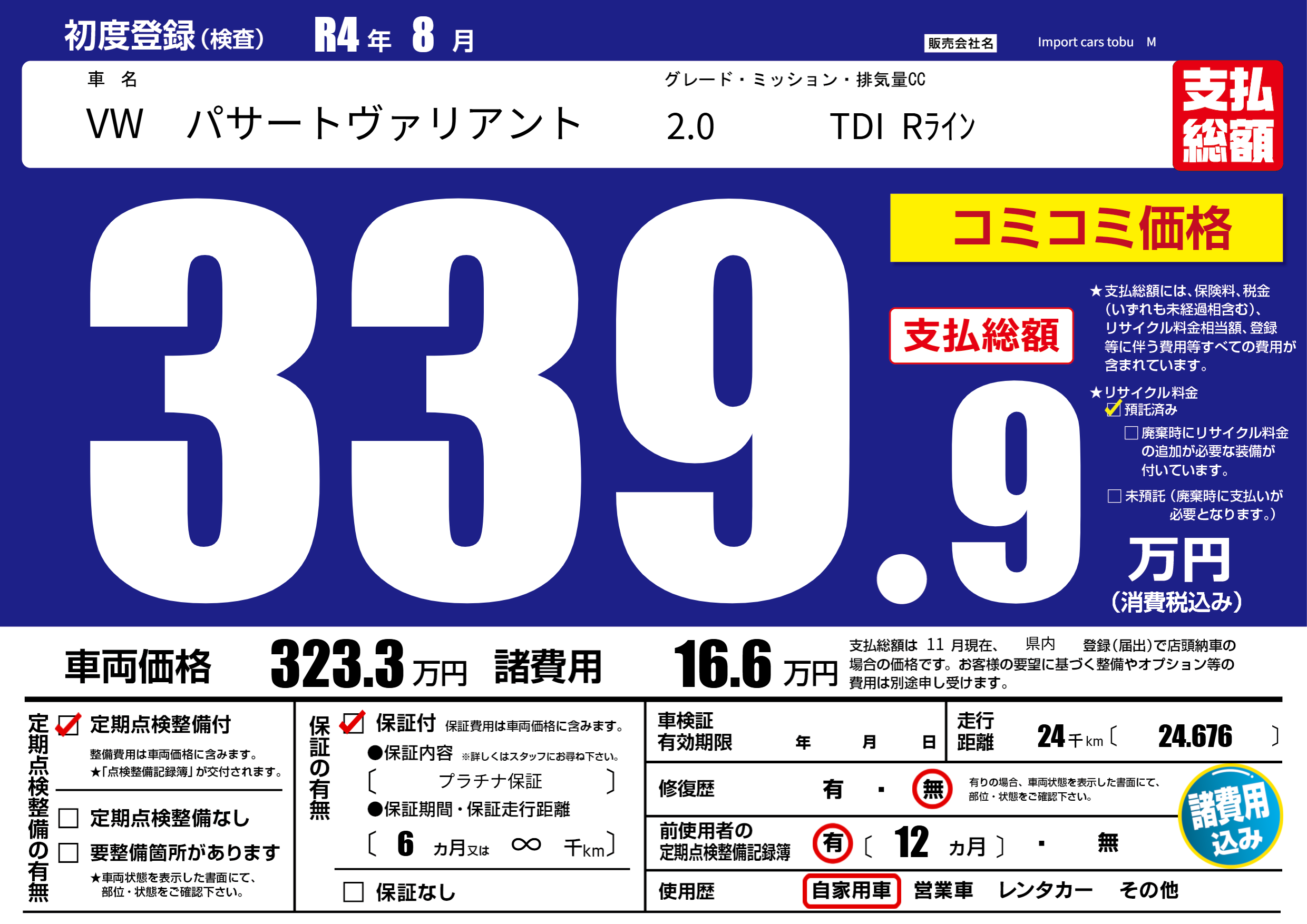 | 車名 | VW パサートヴァリアント | グレード ミッション 排気量 |