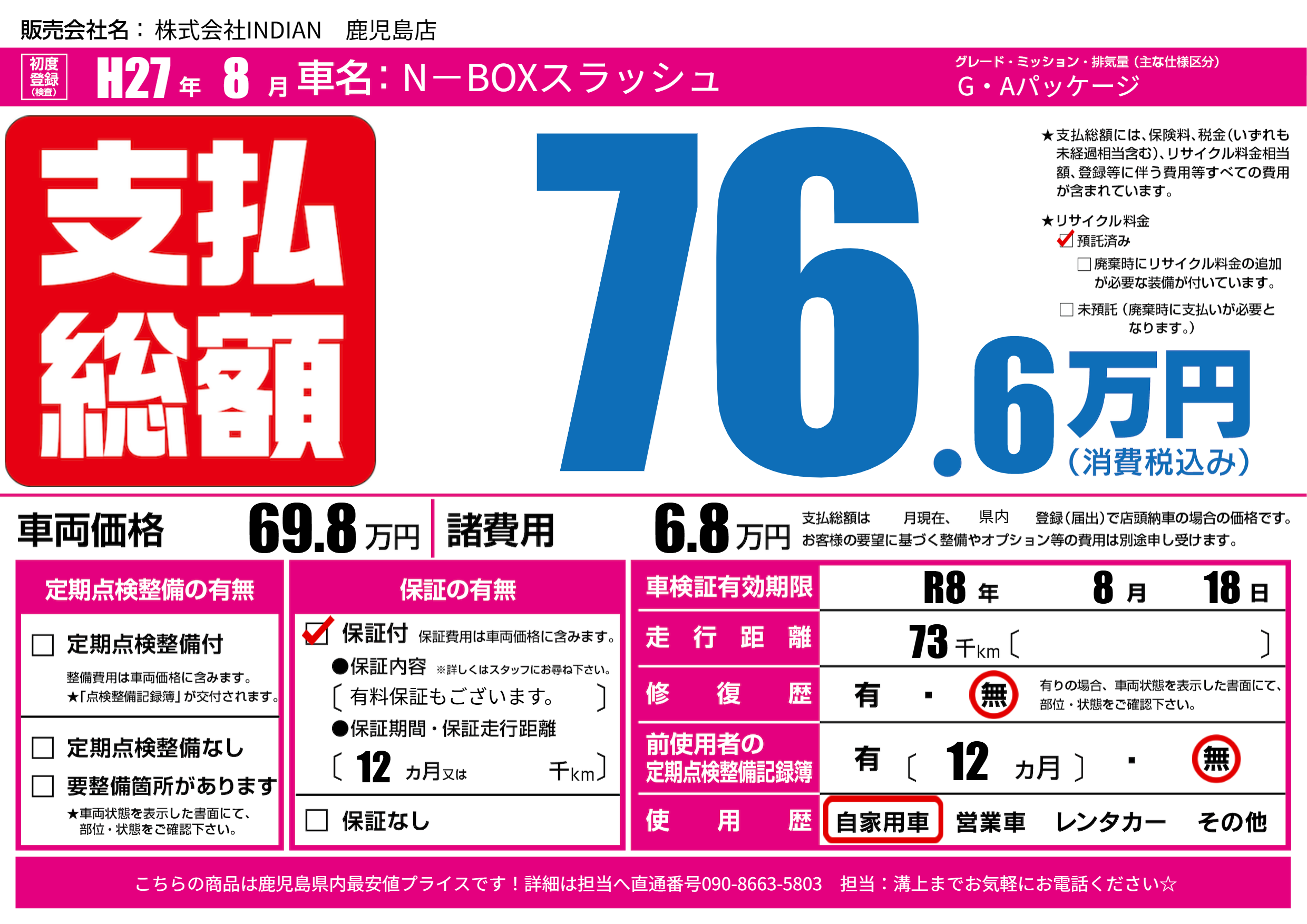 | 走行キロ | 7.3万km | 初年度登録 | H27年8月 |