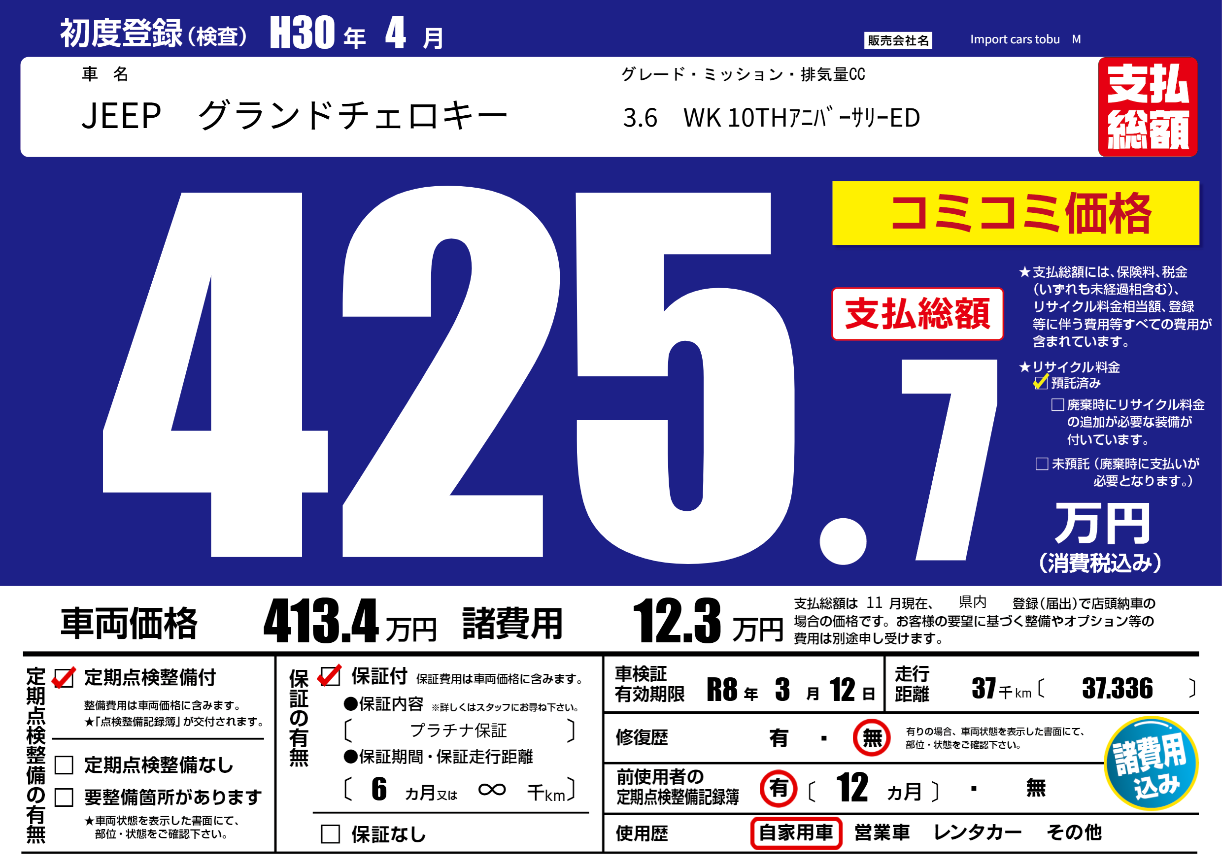 | 車名 | JEEP グランドチェロキー | グレード ミッション 排気量 |