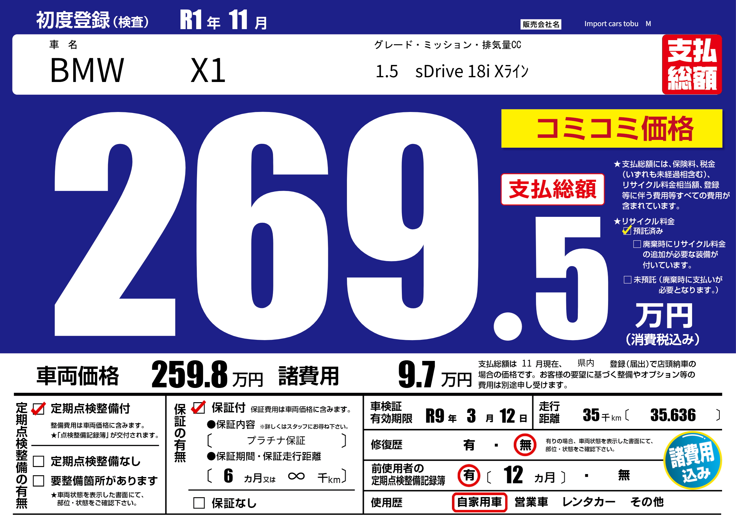 保証付き 保証内容( プラチナ保証) 6ヶ月または(∞)千kmまで |