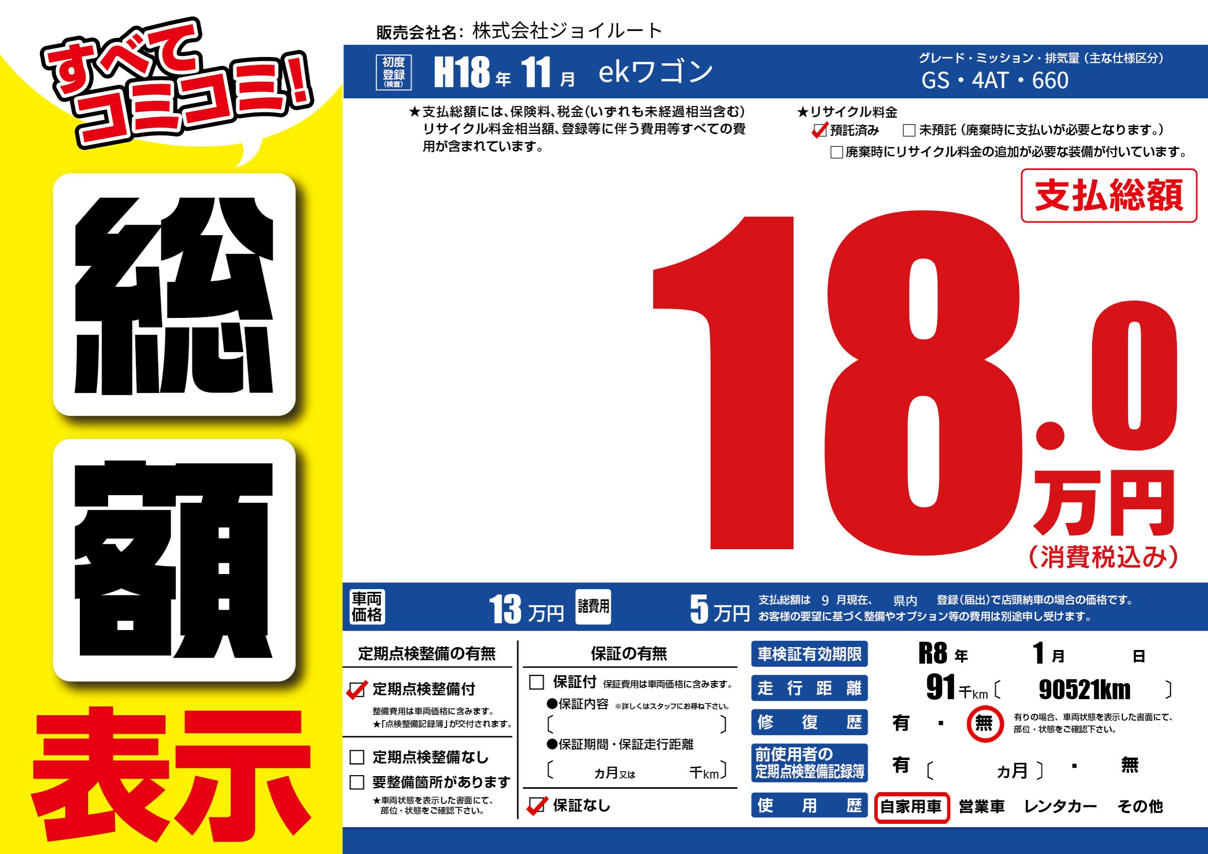 | 走行キロ | 9.1万km | 初年度登録 | H18年11月 |