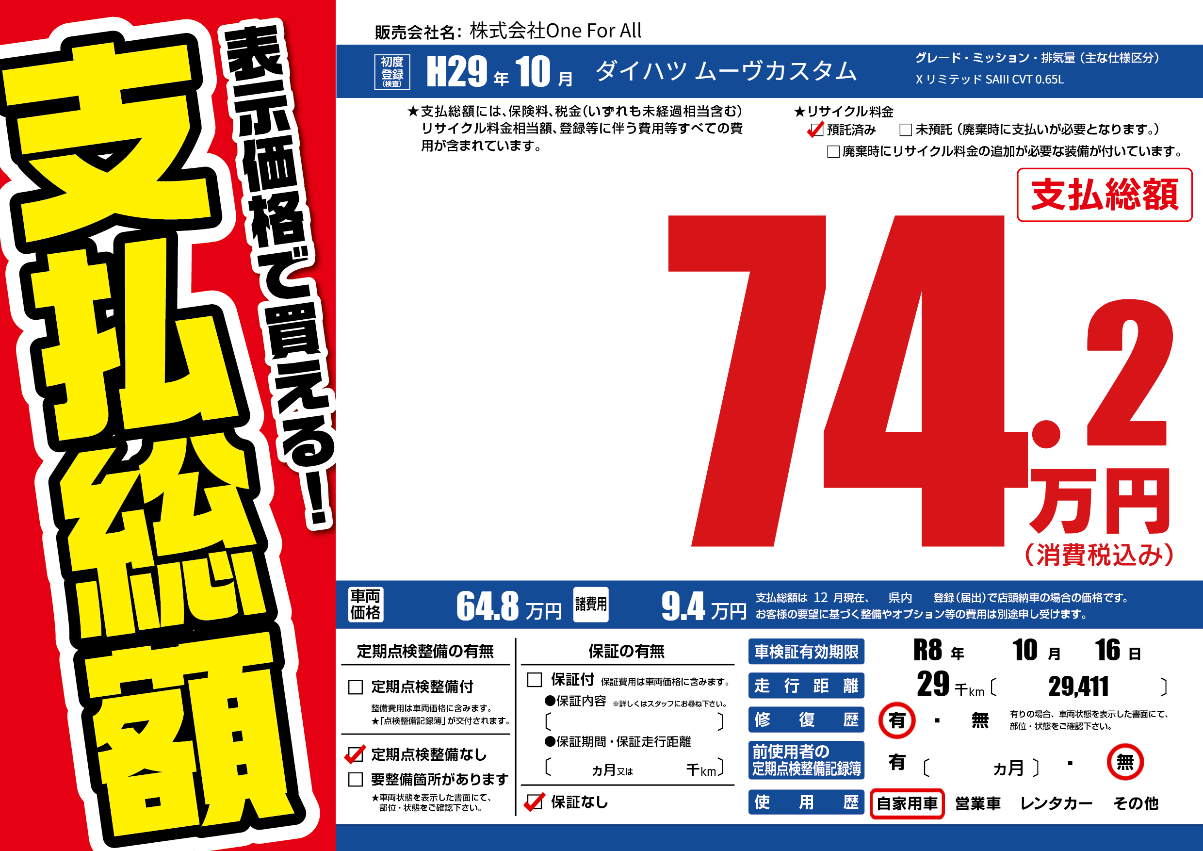 | 走行キロ | 2.9万km | 初年度登録 | H29年10月 |