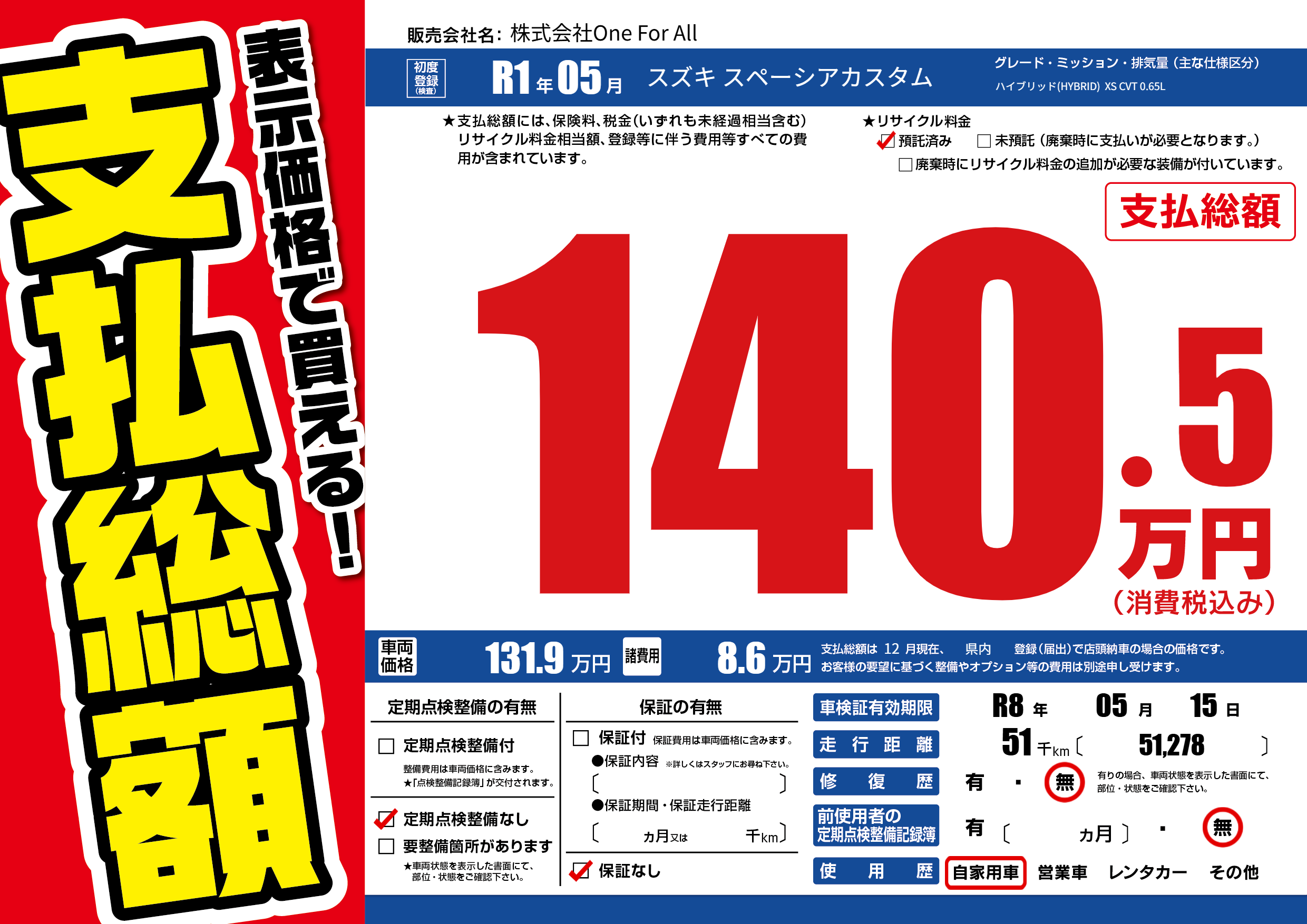 | 車名 | スズキ スペーシアカスタム | グレード ミッション 排気量 |