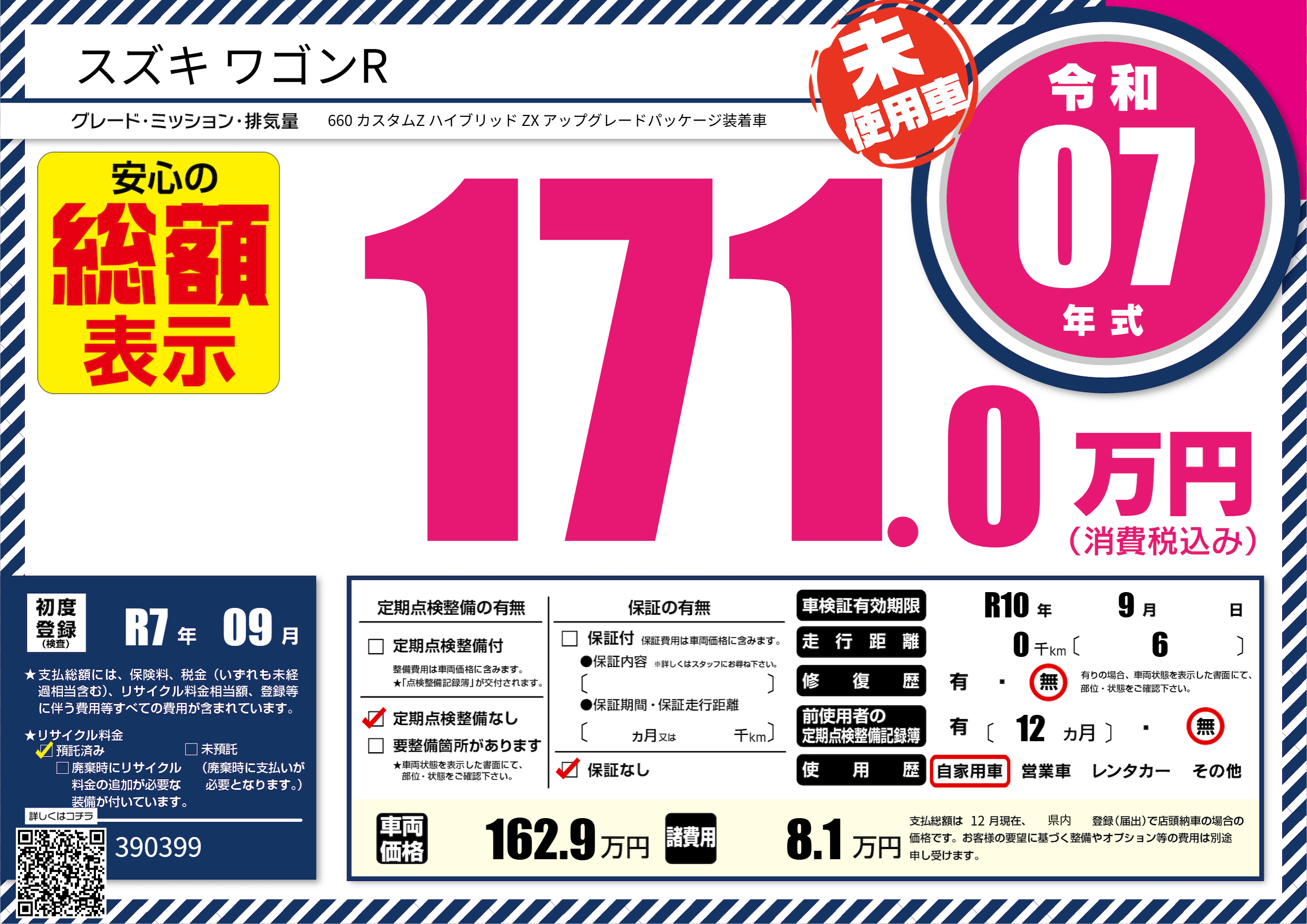 | 走行キロ | - | 初年度登録 | R7年09月 |