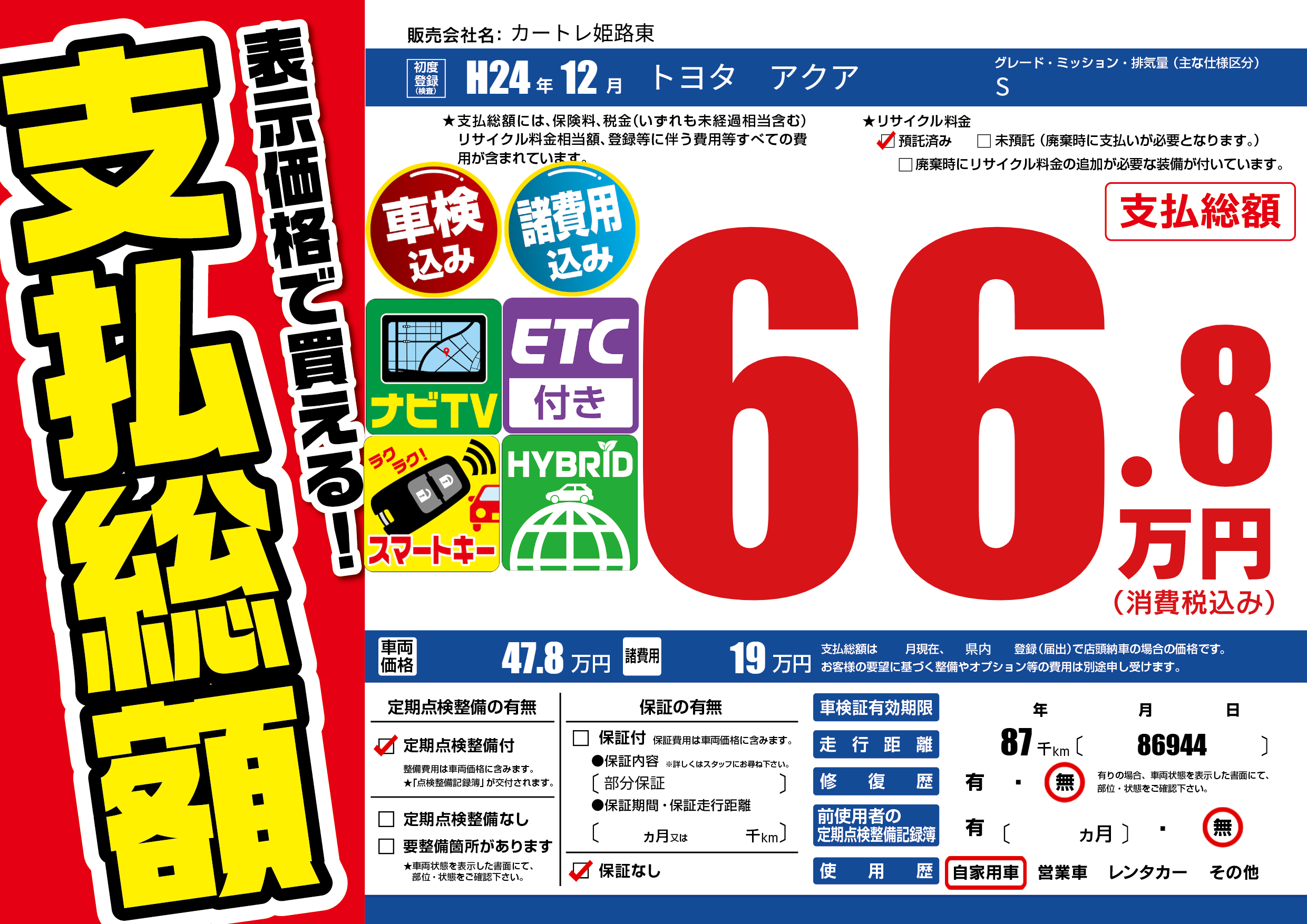 | 走行キロ | 8.7万km | 初年度登録 | H24年12月 |
