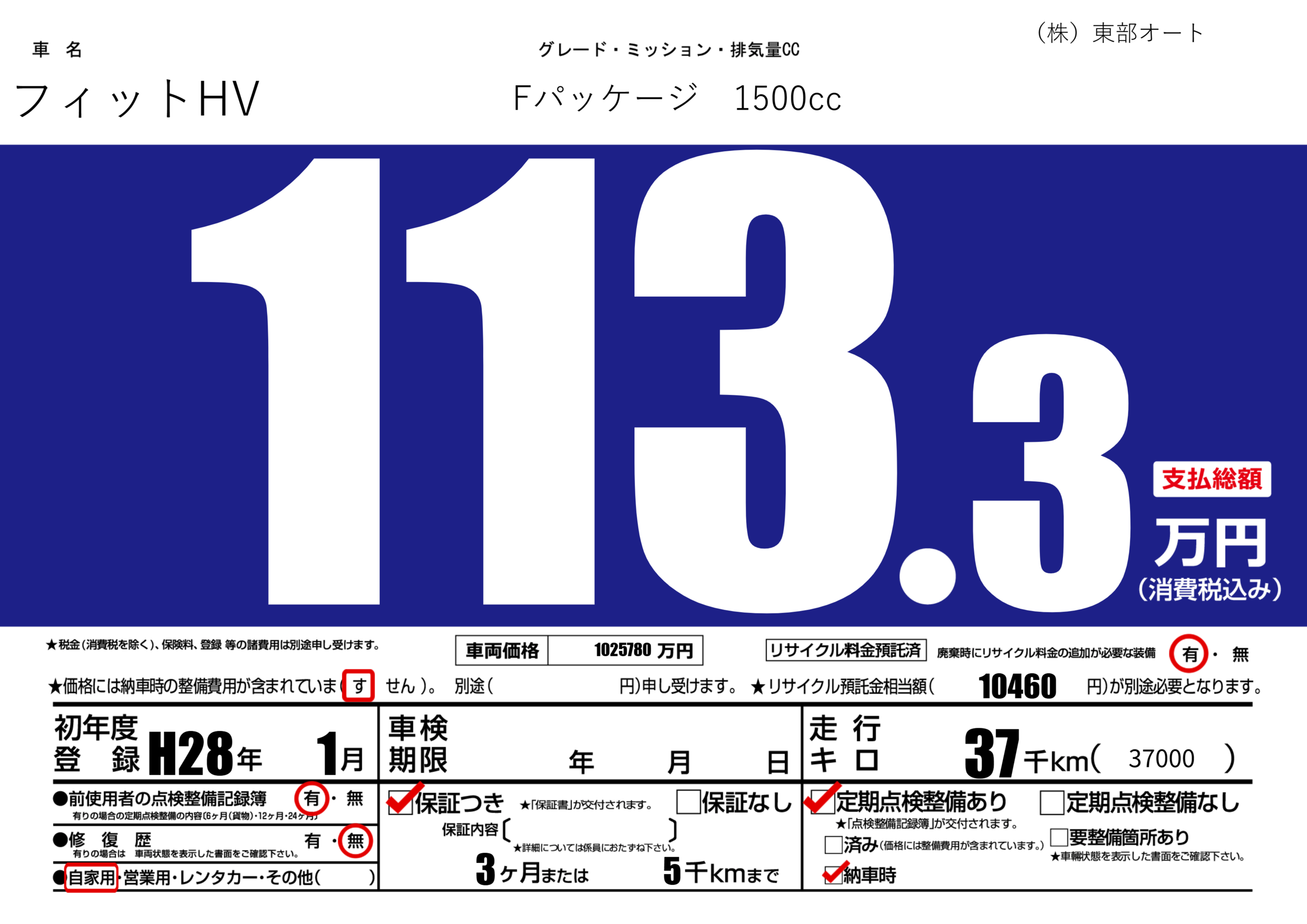 保証付き 保証内容(---) 3ヶ月または(5)千kmまで |