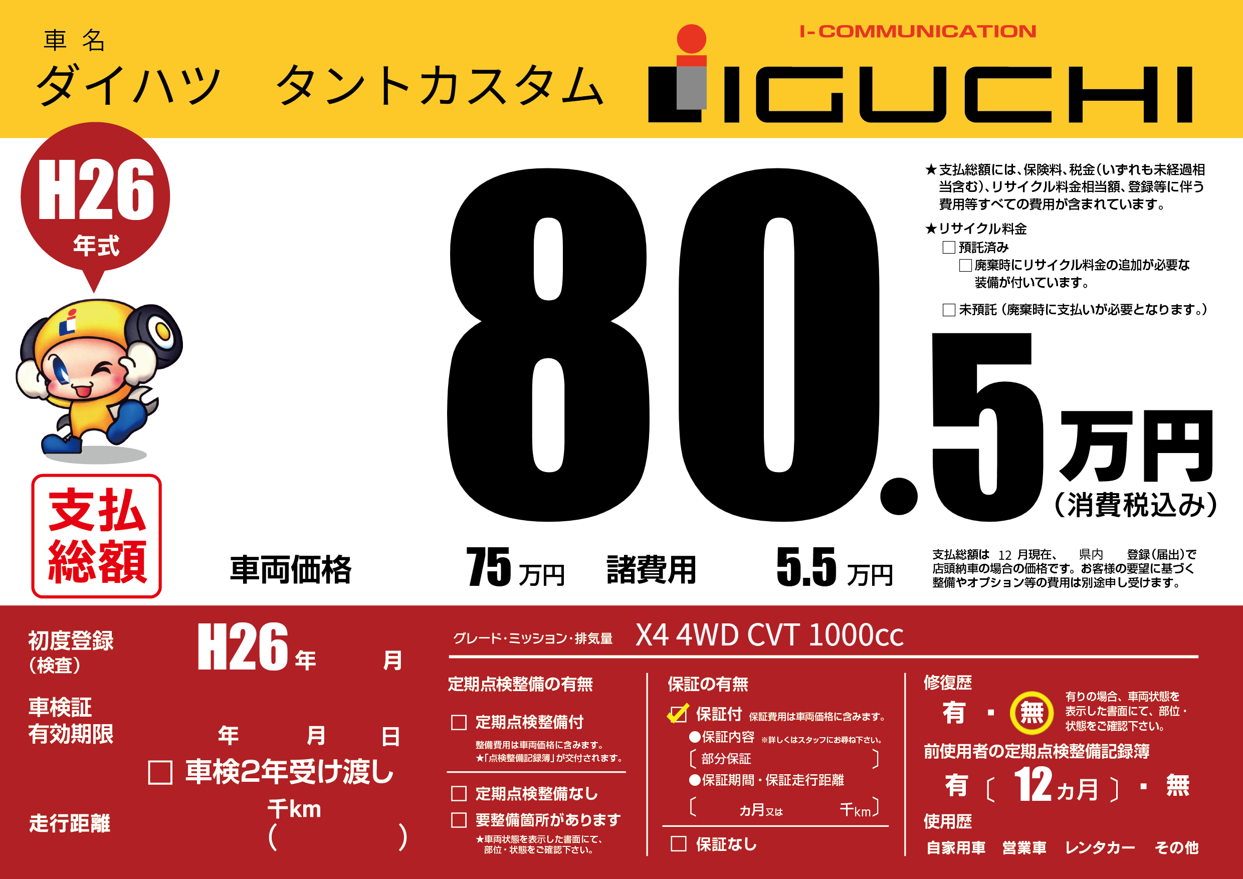 保証付き 保証内容(部分保証) ---ヶ月または()千kmまで |