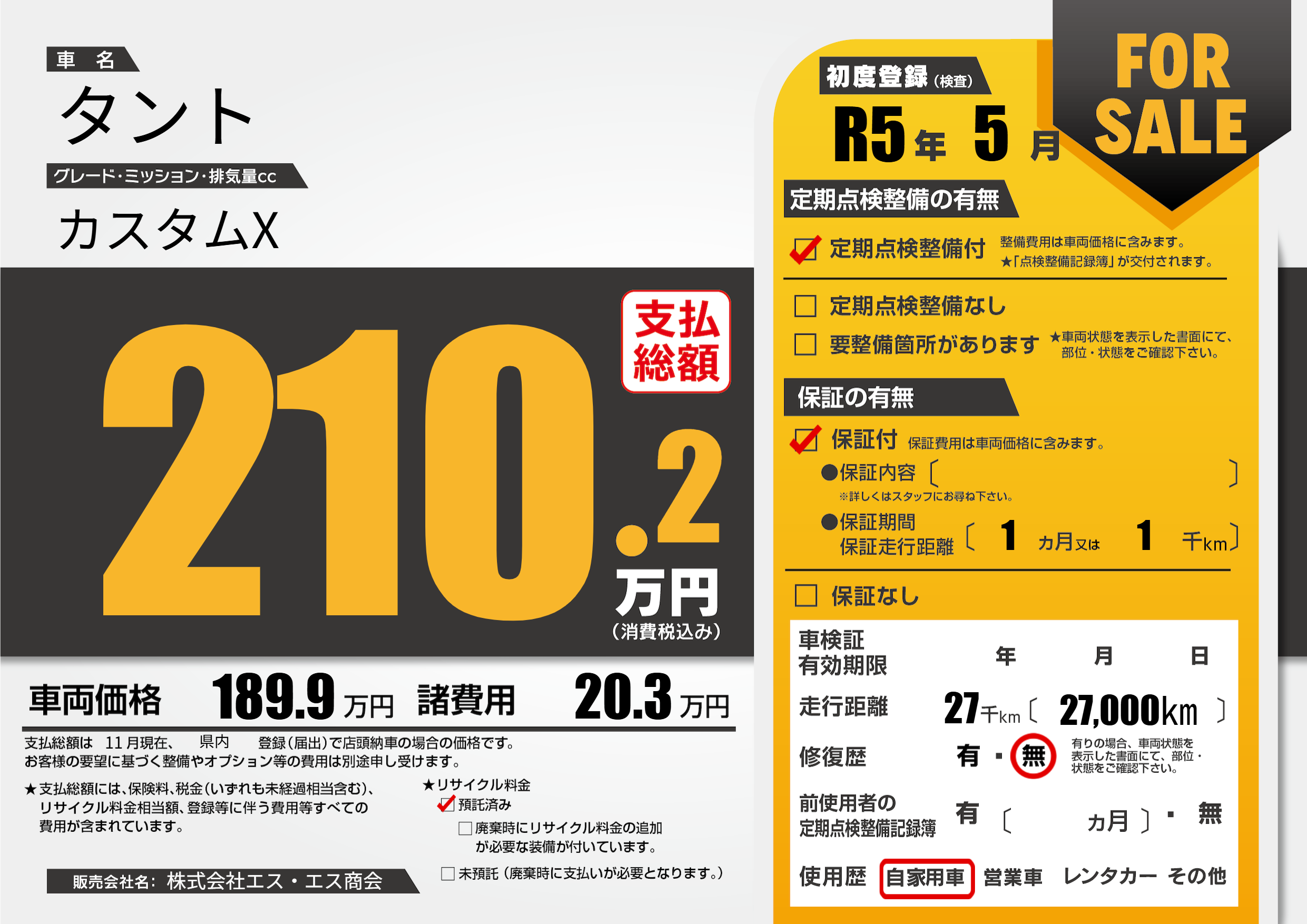 | 走行キロ | 2.7万km | 初年度登録 | R5年5月 |
