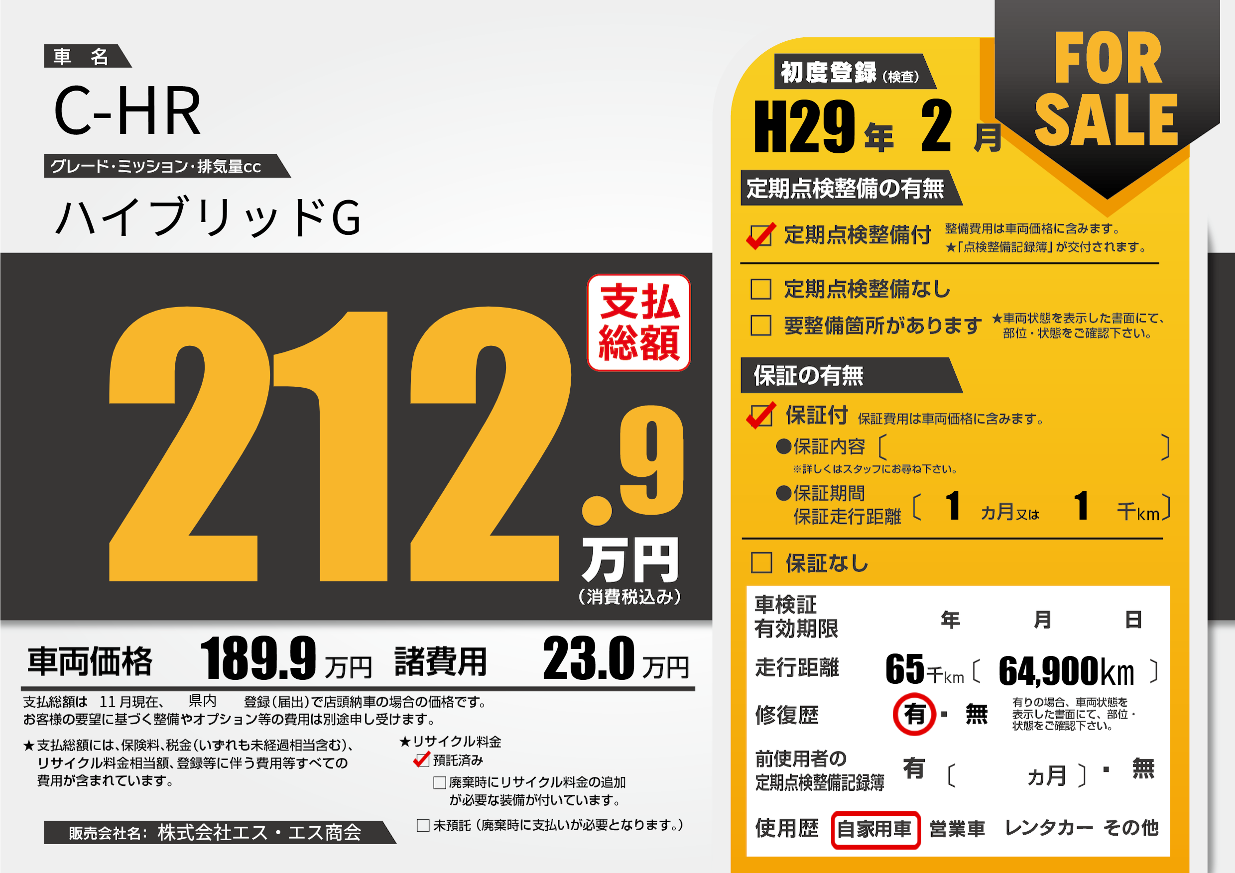 | 車名 | C-HR | グレード ミッション 排気量 |