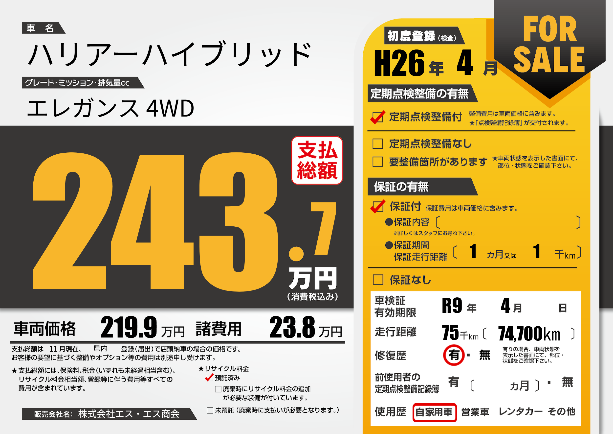 | 走行キロ | 7.5万km | 初年度登録 | H26年4月 |