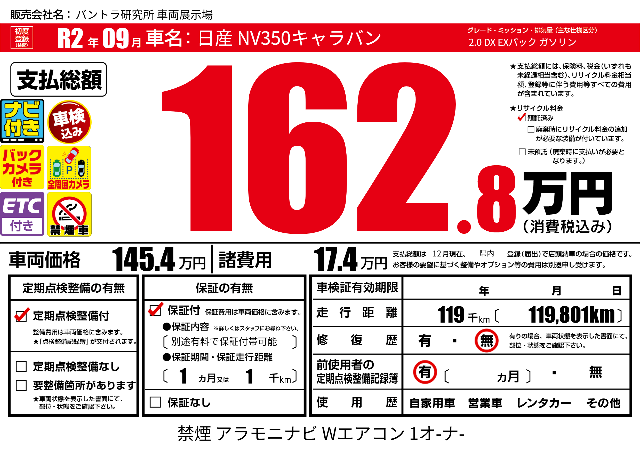 | 走行キロ | 11.9万km | 初年度登録 | R2年09月 |