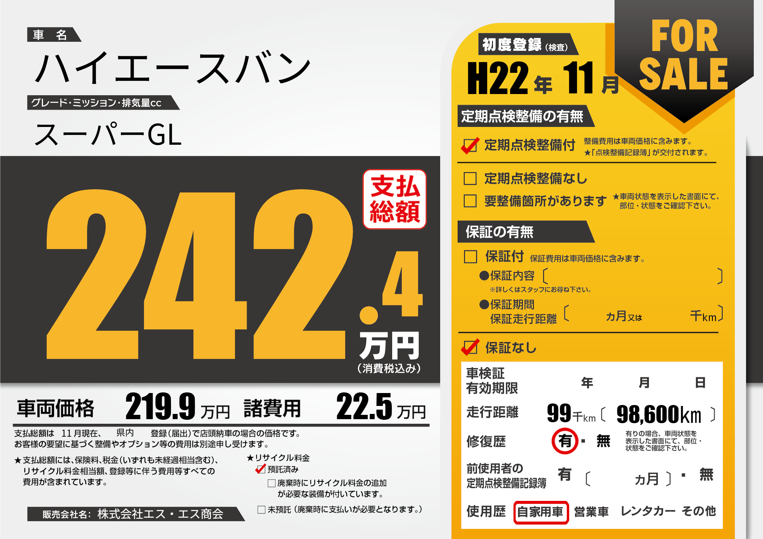 | 走行キロ | 9.9万km | 初年度登録 | H22年11月 |