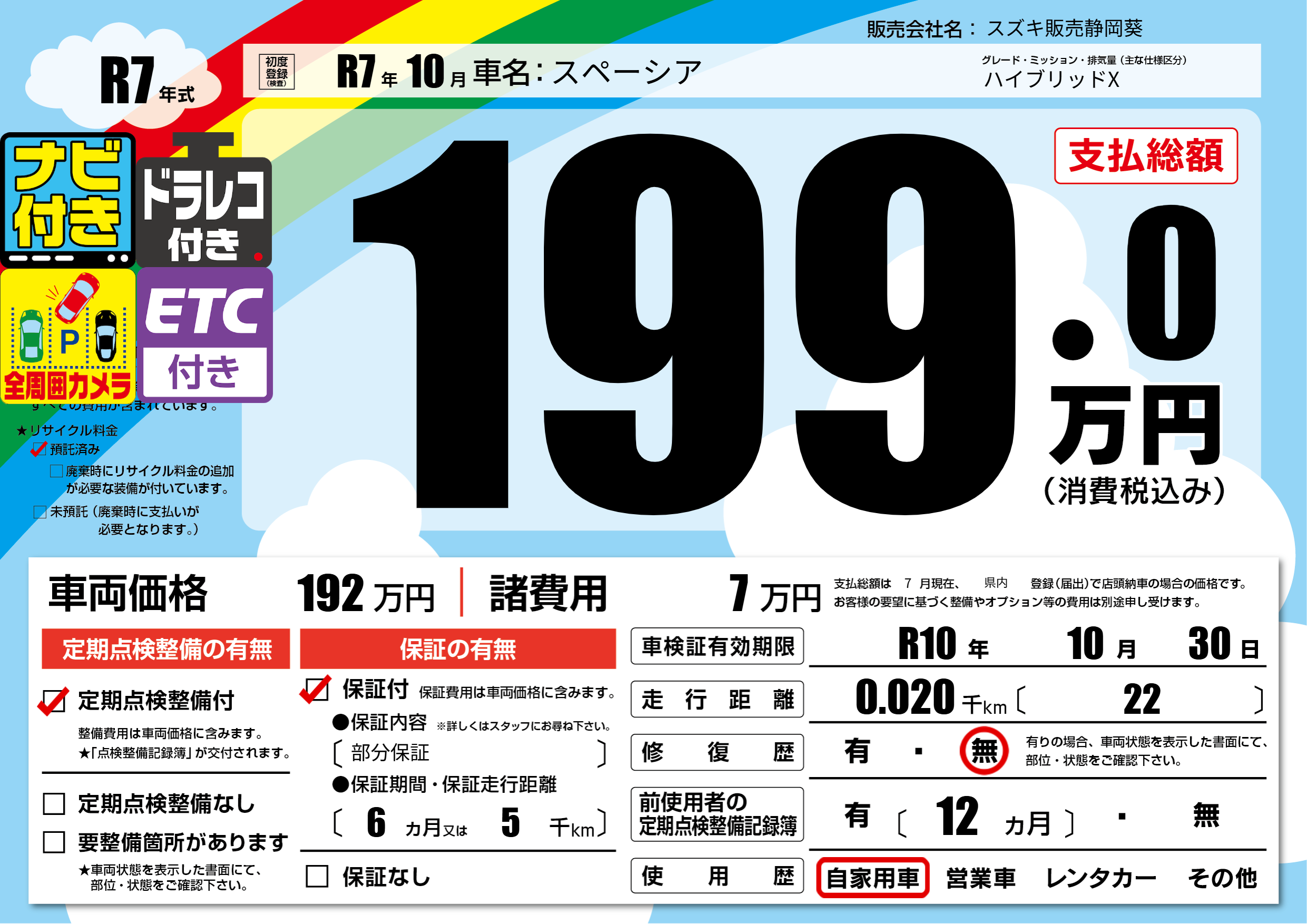 | 走行キロ | - | 初年度登録 | R7年10月 |