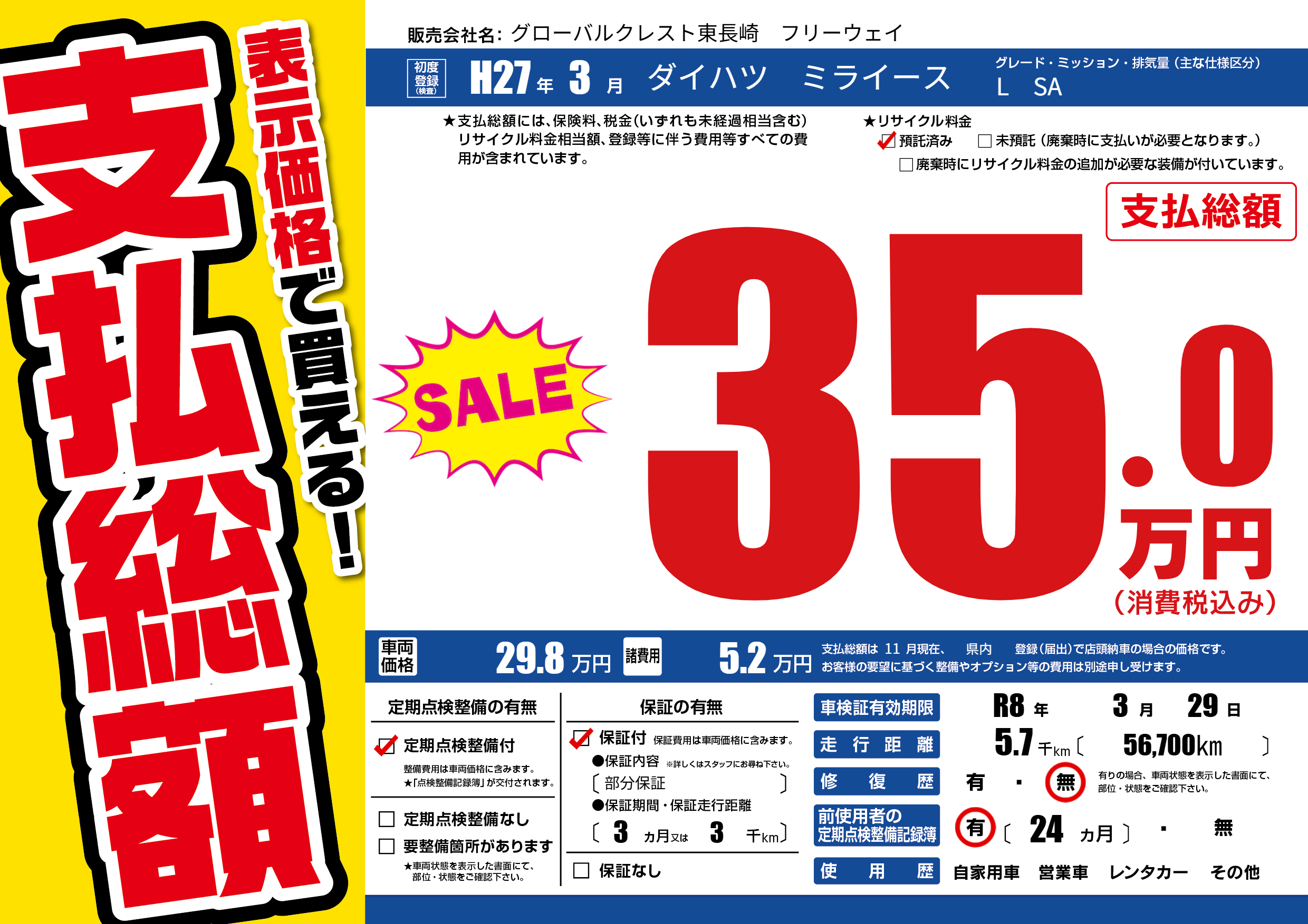 | 走行キロ | 0.5万km | 初年度登録 | H27年3月 |