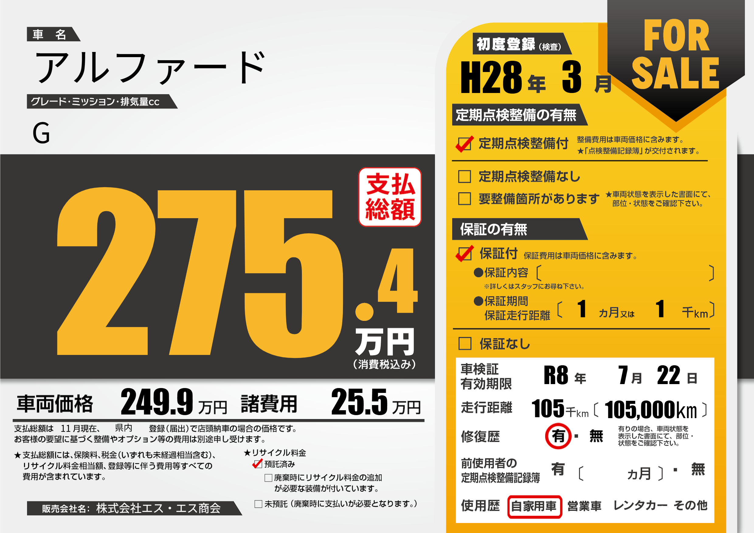 | 車名 | アルファード | グレード ミッション 排気量 |