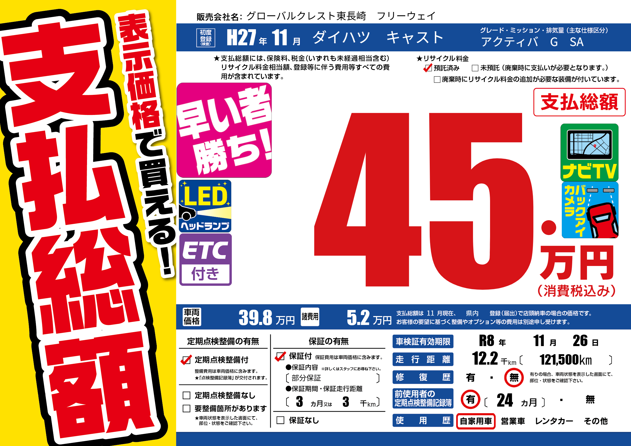 | 車名 | ダイハツ キャスト | グレード ミッション 排気量 |
