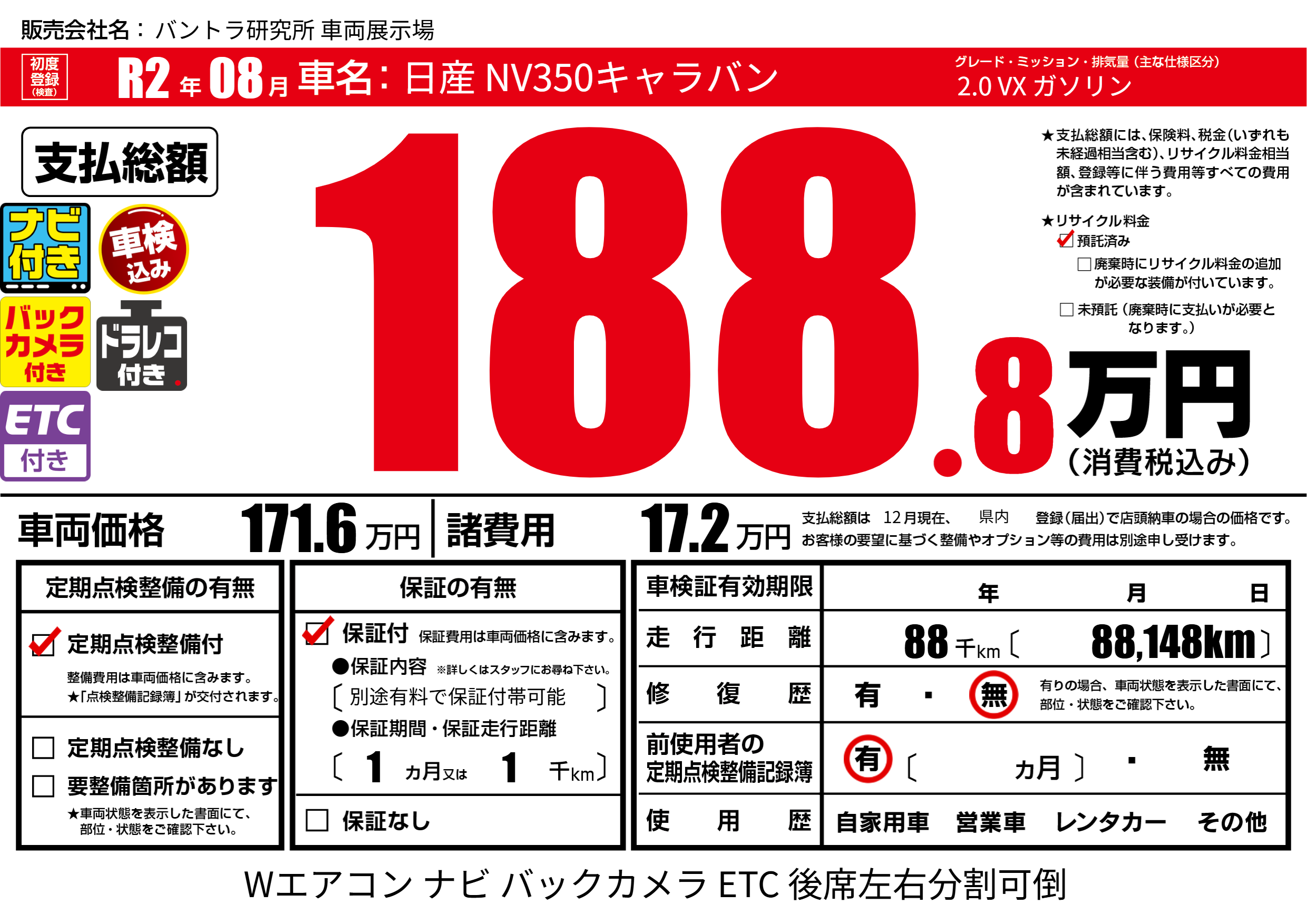 | 走行キロ | 8.8万km | 初年度登録 | R2年08月 |