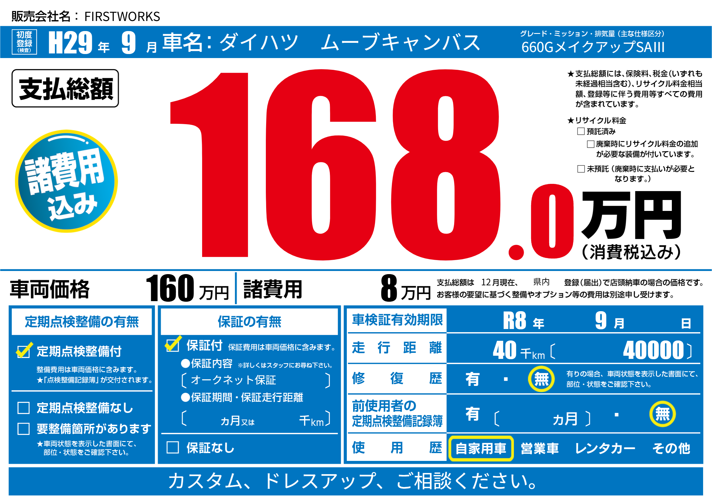 | 走行キロ | 4万km | 初年度登録 | H29年9月 |