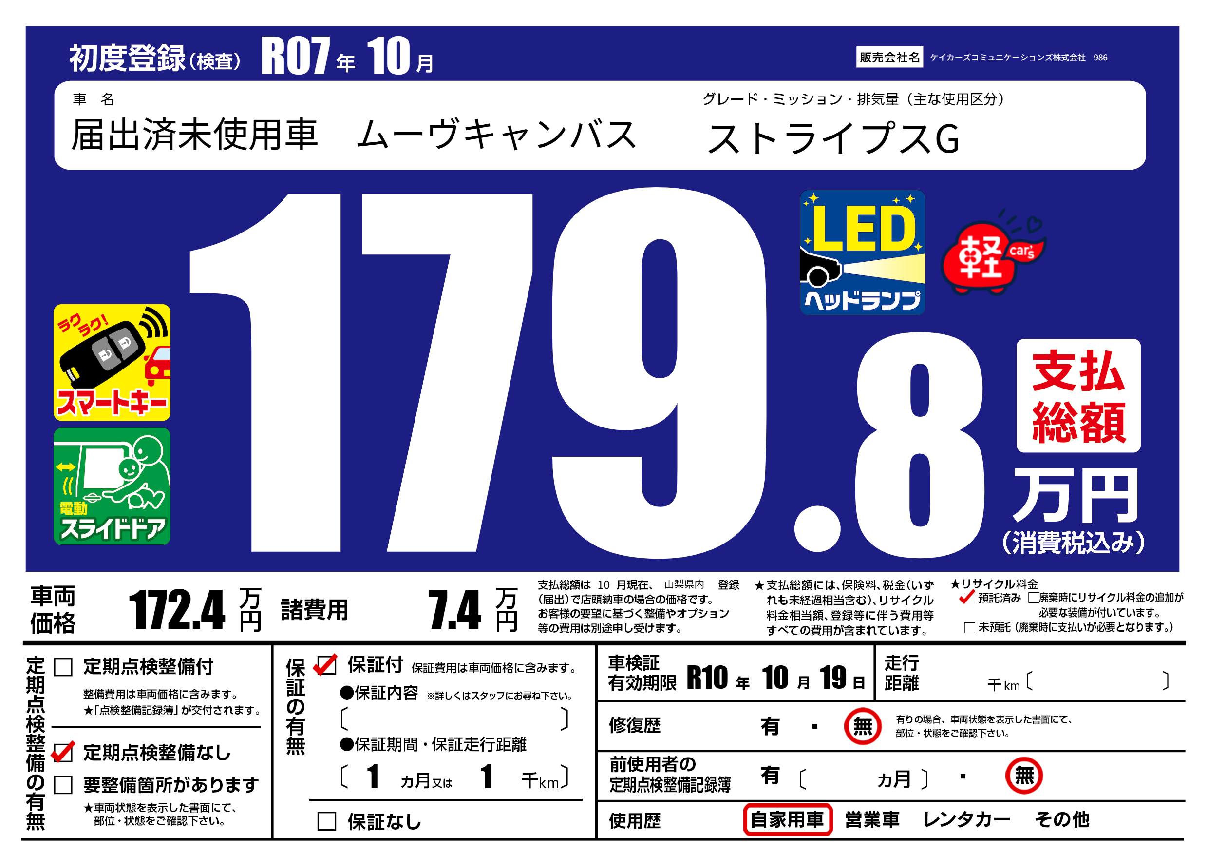 | 走行キロ | - | 初年度登録 | R07年10月 |