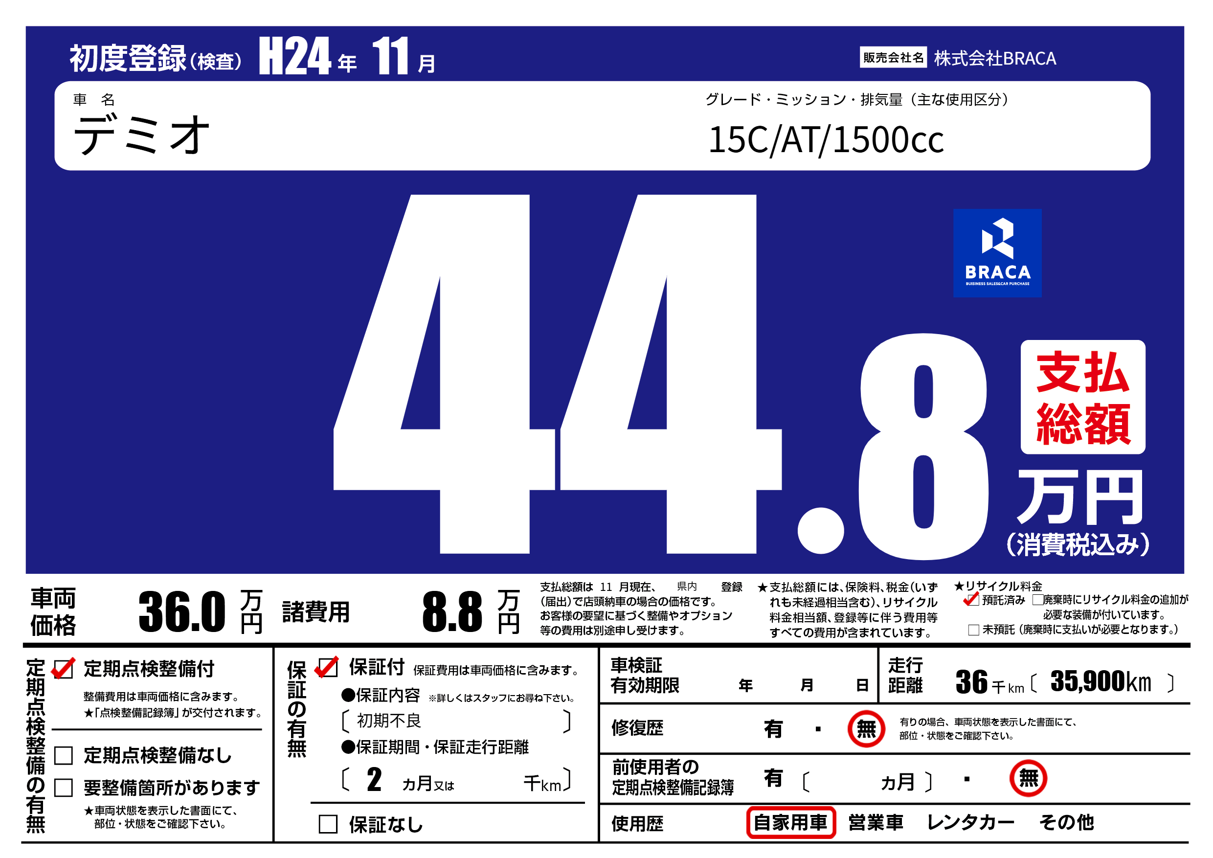 | 走行キロ | 3.6万km | 初年度登録 | H24年11月 |