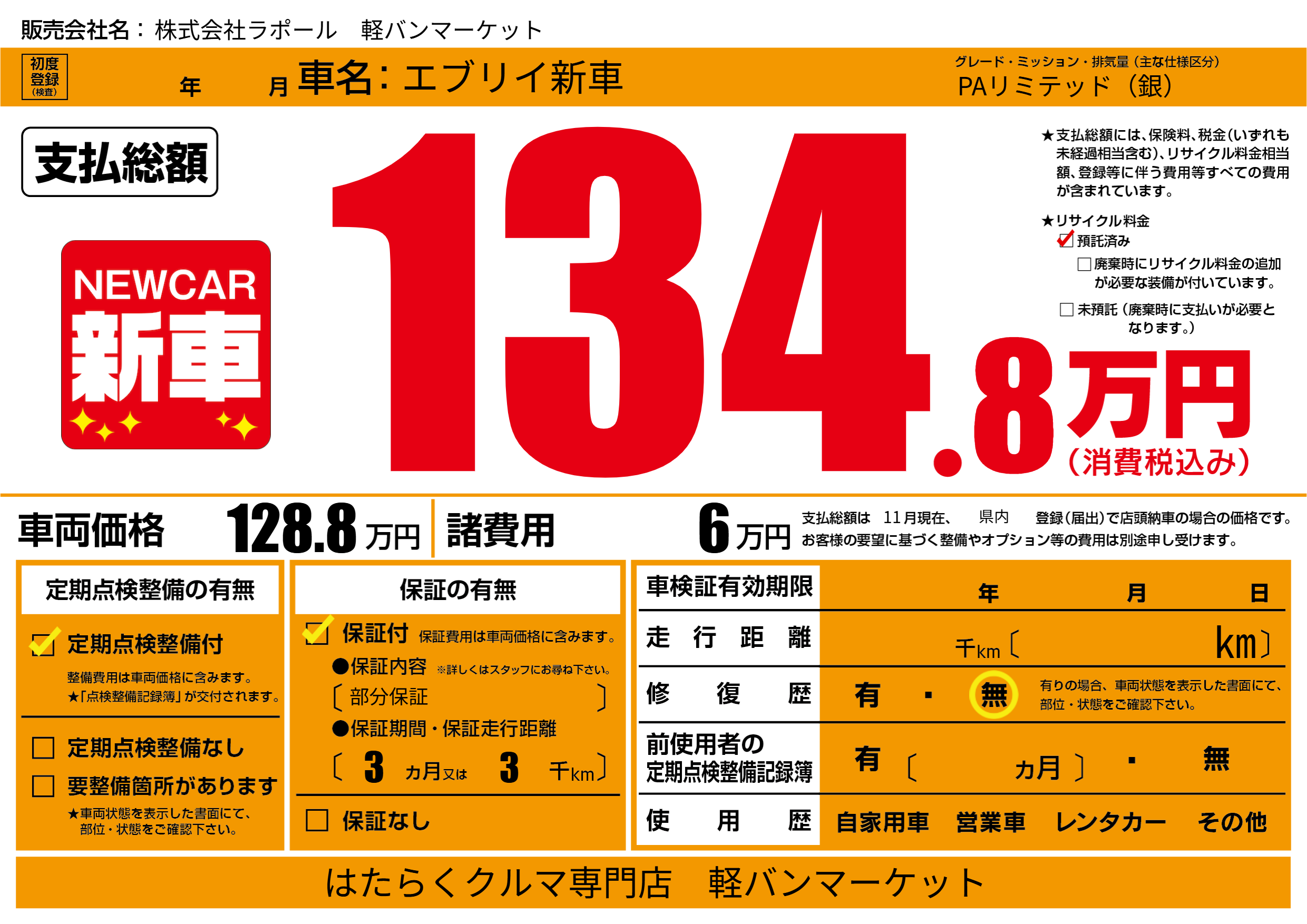 | 車名 | エブリイ新車 | グレード ミッション 排気量 |