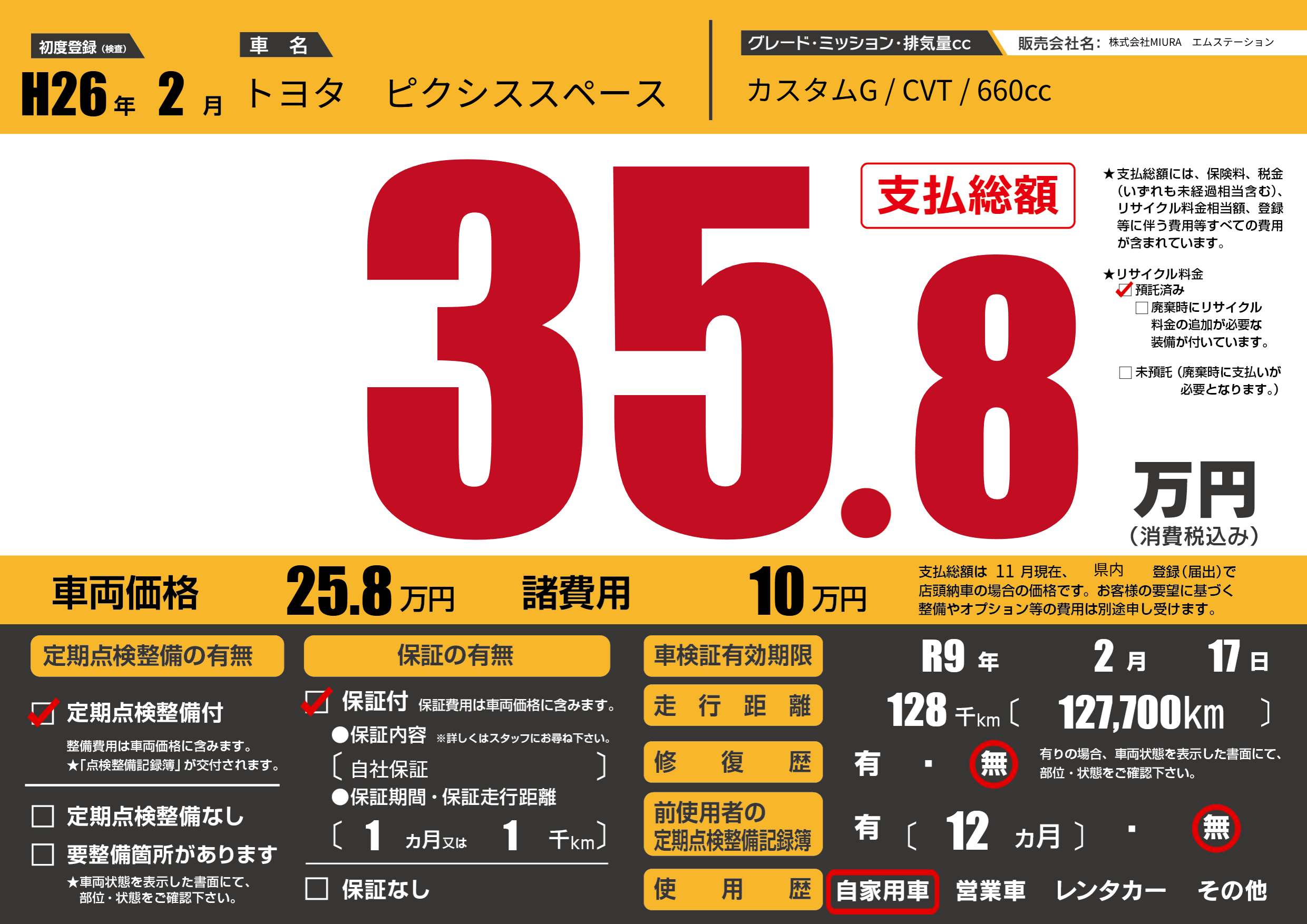 | 走行キロ | 12.8万km | 初年度登録 | H26年2月 |