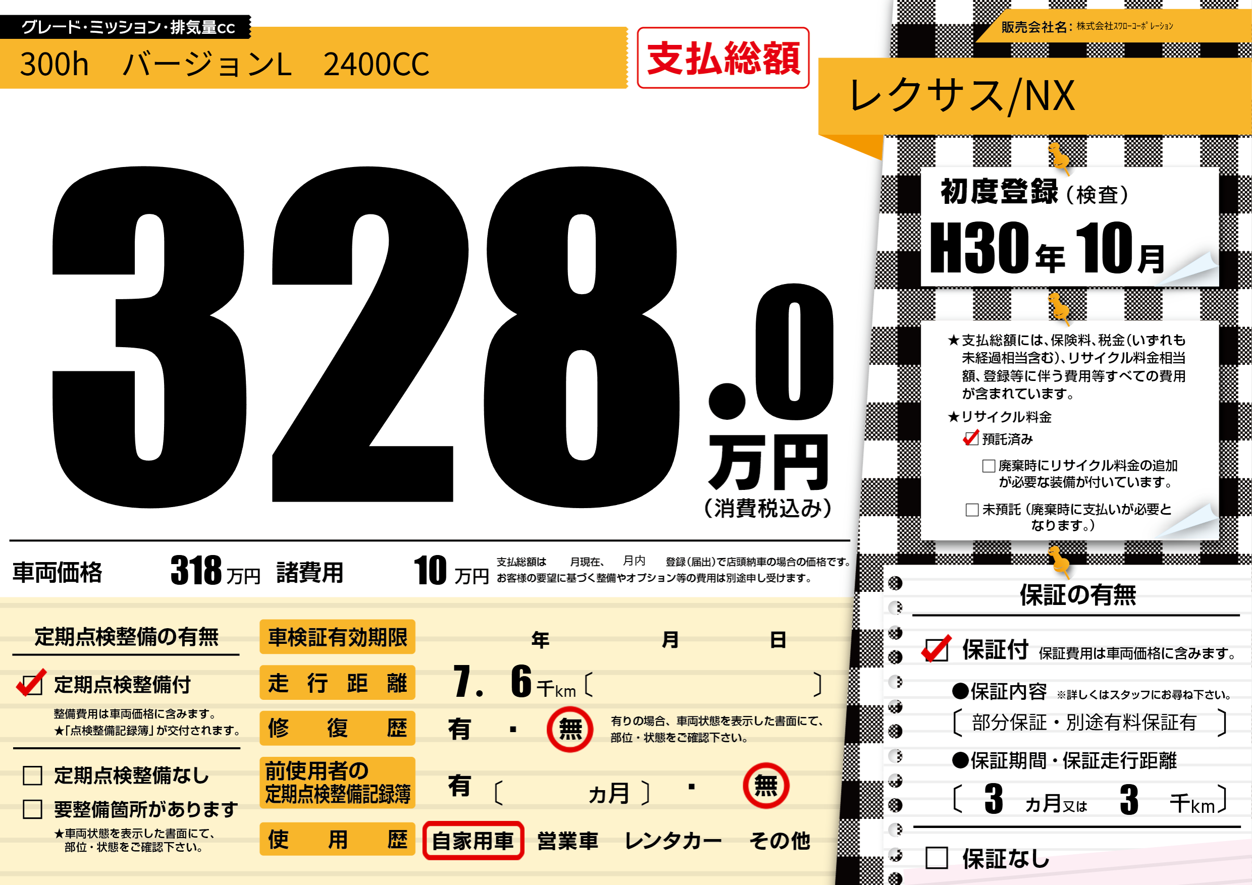 | 車名 | レクサス/NX | グレード ミッション 排気量 |