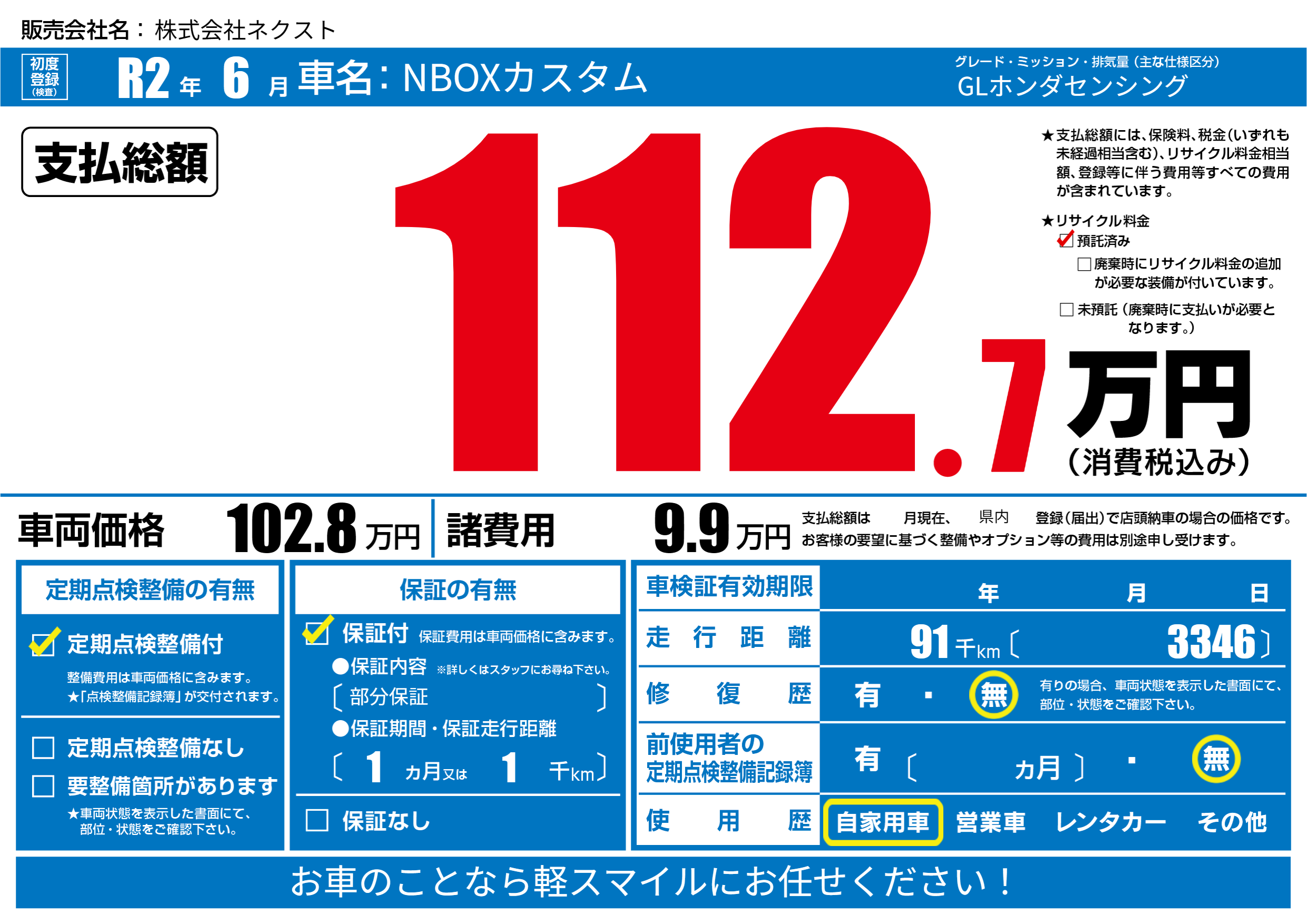 | 車名 | NBOXカスタム | グレード ミッション 排気量 |