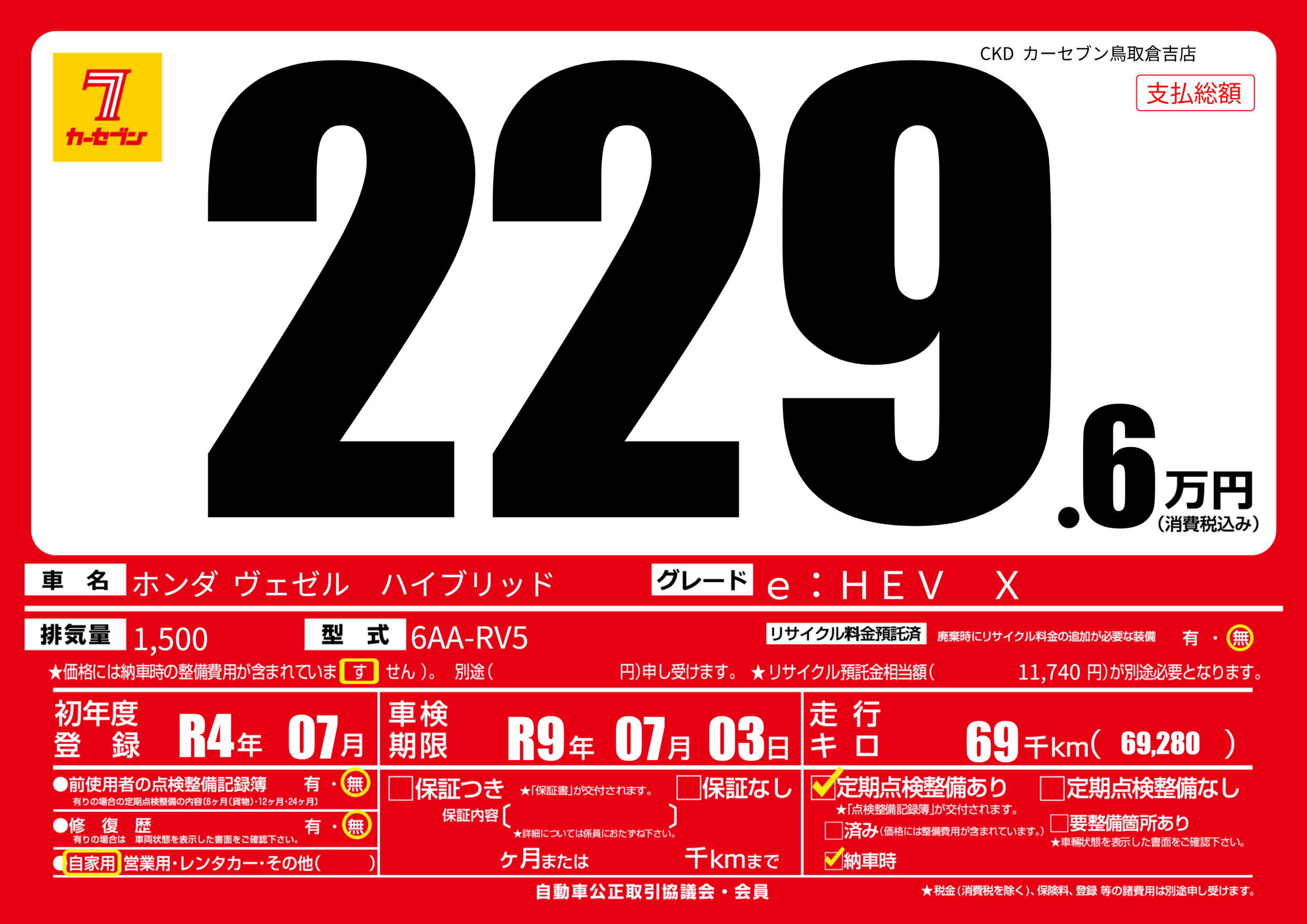 | 車名 | ホンダ ヴェゼル ハイブリッド | グレード ミッション 排気量 |