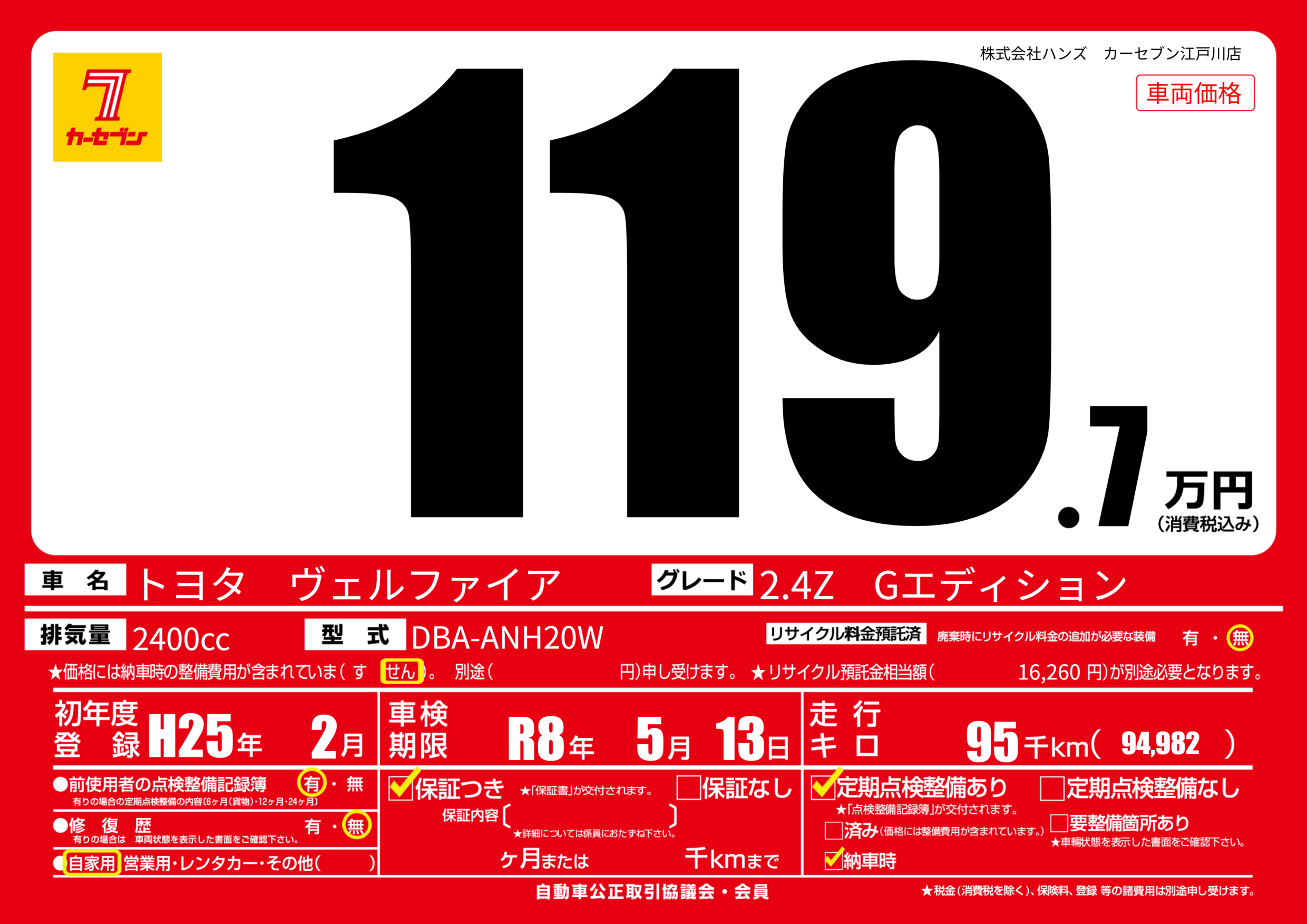 | 走行キロ | 9.5万km | 初年度登録 | H25年2月 |
