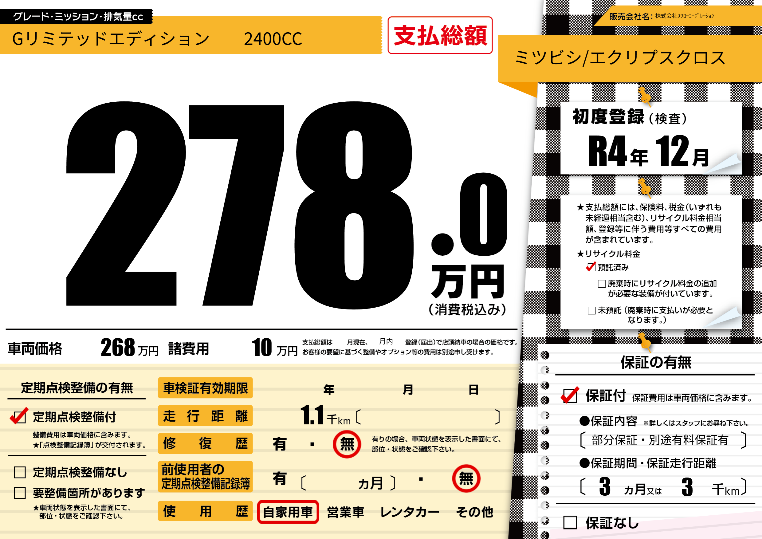| 車名 | ミツビシ/エクリプスクロス | グレード ミッション 排気量 |