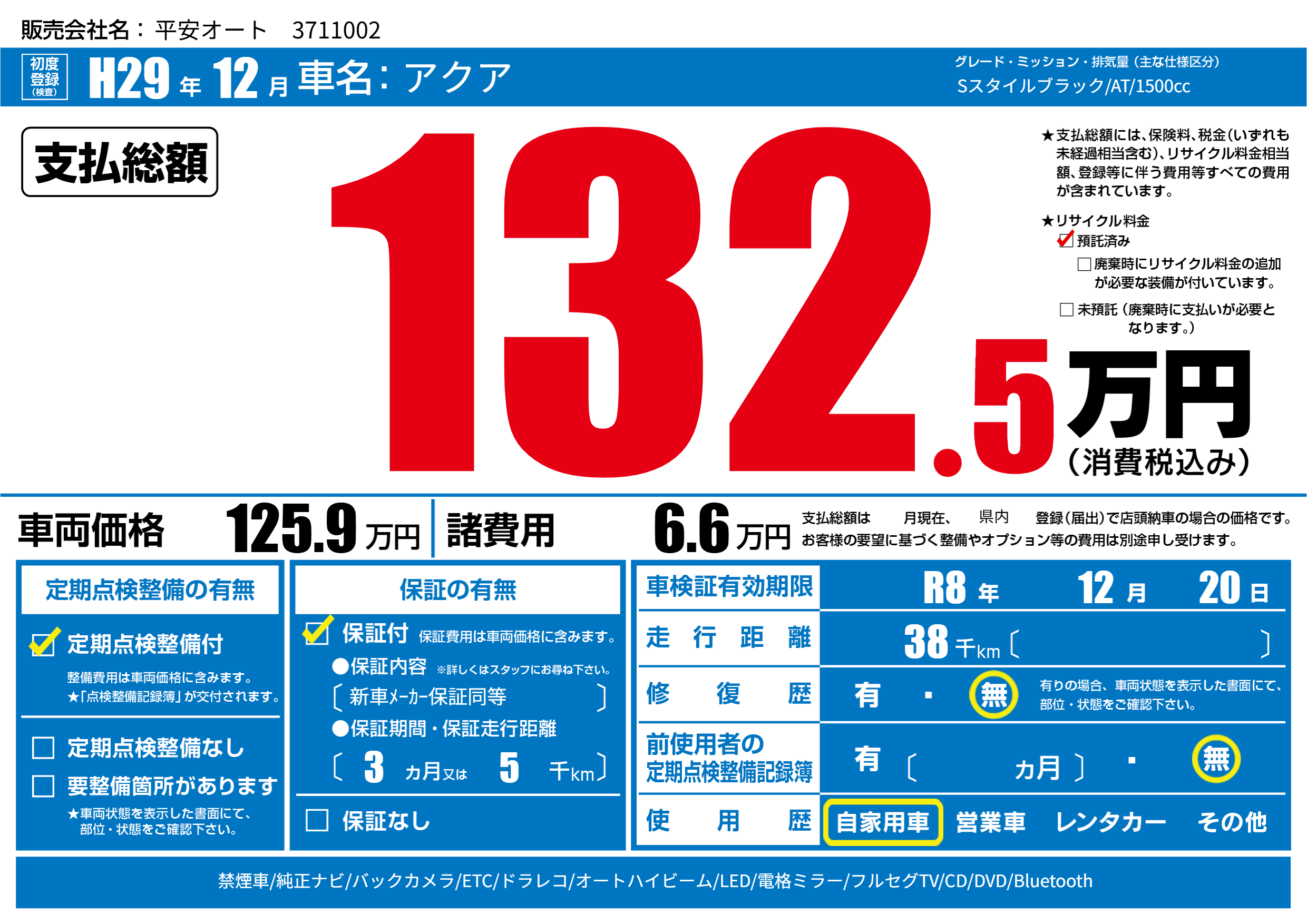 | 走行キロ | 3.8万km | 初年度登録 | H29年12月 |