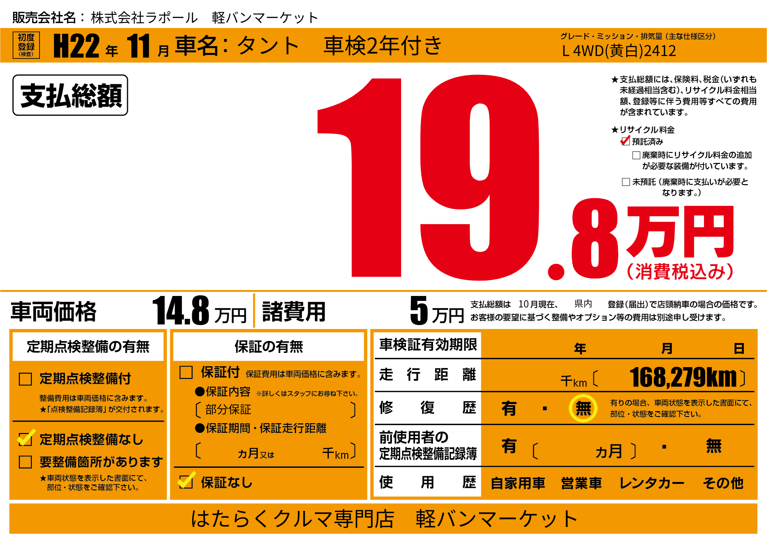 | 車名 | タント 車検2年付き | グレード ミッション 排気量 |