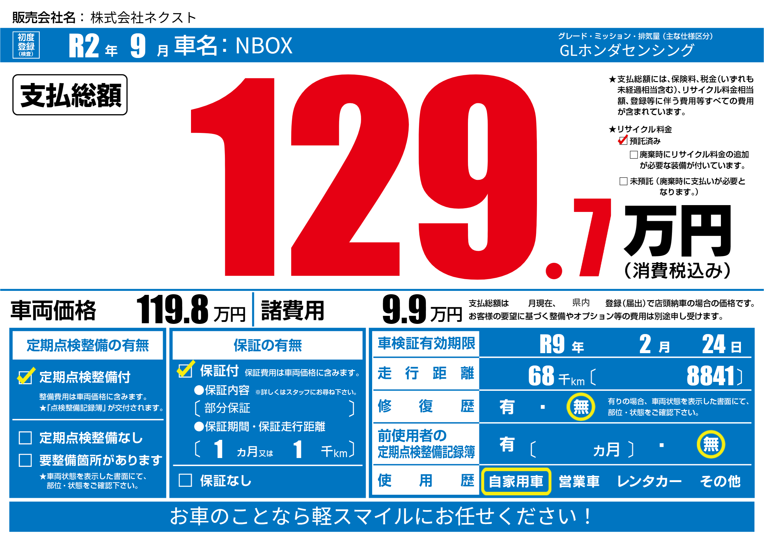 | 車名 | NBOX | グレード ミッション 排気量 |