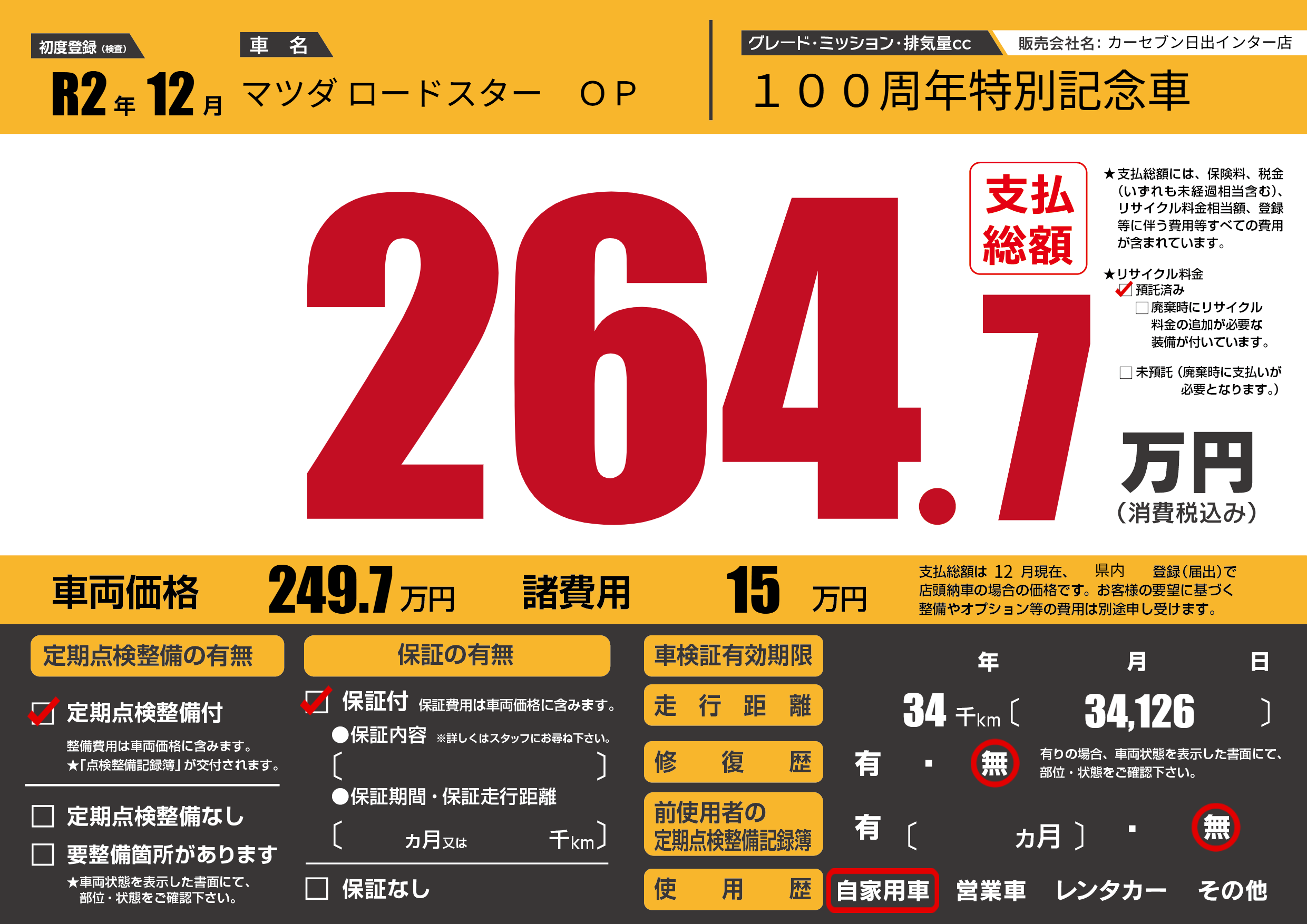 | 車名 | マツダ ロードスター OP | グレード ミッション 排気量 |