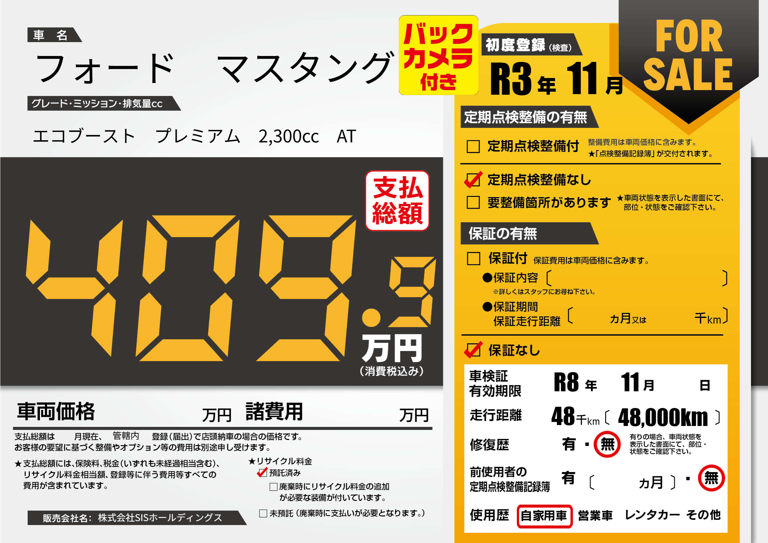 | 車名 | フォード マスタング | グレード ミッション 排気量 |